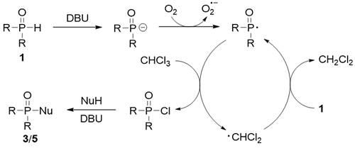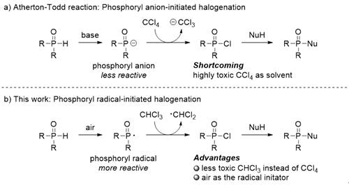 In this reaction, air was used as the free radical initiator, and P (o) H compound produced phosphorus free radical by self oxidation in air.Then, the highly active p-radicals grab the chlorine atoms in chloroform to form phosphoryl chloride, and the dichloromethyl radical can further grab the protons in P (o) H compounds to produce new phosphorus radicals.Finally, phosphoryl chloride reacts with nucleophilic reagent to form phosphorylation product (scheme 2).Compared with the traditional Atherton− Todd reaction, this method has the following advantages: 1) replacing highly toxic carbon tetrachloride (reaction solvent) with 1 equivalent of chloroform with low toxicity; 2) using environment-friendly air as phosphorus free radical initiator; 3) various suitable reaction solvents; 4) wide substrate adaptability; 5) 10 g scale reaction.