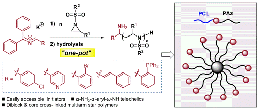 N-The living anionic ring opening polymerization of sulfonyl substituted azacyclopropanes is an important synthetic method for the synthesis of linear polyethyleneimine based polymers. However, the initiator of the polymerization is often limited to the non functionalized n-benzyl-sulfonamide, which is not conducive to the functionalization of the end of the polymer chain or the synthesis of block or complex topological polyethyleneiminesBased polymer materials.In this study, 2-azaallyl anions were used as initiators for ring opening polymerization of N-sulfonyl substituted azacyclopropanes for the first time, and polyaazacyclopropane telechelic polymers with primary amine as terminal group were synthesized by ring opening polymerization and hydrolysis of end group imines by "one pot method" (Fig. 1).The polymerization products have clear end groups, narrow dispersion (ࠨ < 1.20), and the molecular weight can be strictly controlled by the ratio of monomer to initiator.Kinetic studies revealed the first-order reaction kinetics and "living" polymerization characteristics with controllable molecular weight.The end group of the synthesized telechelic polymer has primary amine group, which can further initiate the ring opening polymerization of ε - caprolactone to prepare paz-b-pcl block polymer under the catalysis of stannous octanoate.In addition, the ω - NH end group of the telechelic polymer can also be used as the initiator group to synthesize the nuclear crosslinked multi arm star polymer by ring opening polymerization with excess bisphenol a crosslinking agent substituted by diazocyclopropane in the presence of phosphonitrile ligand t-bu-p.4