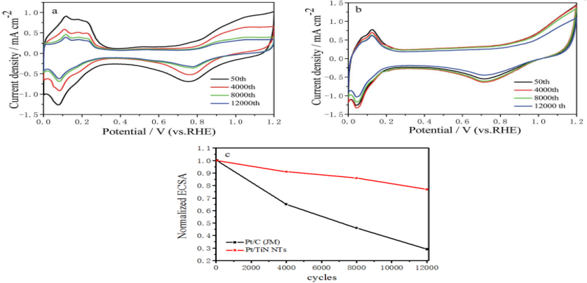 图2 商用Pt/C(JM)和Pt/TiNNTs经过不同圈数ADT测试的CV曲线,电化学活性比表面积损失对比