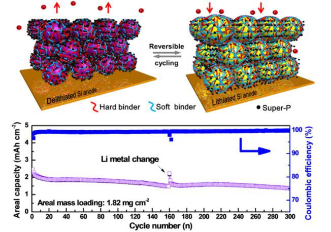 林展教授课题组在高能量密度锂离子电池研究领域取得重要进展,题为“Interweaving 3D network binder for high-areal-capacity Si anode through combined hard and soft polymers”的研究成果发表在国际能源材料领域的权威期刊Adv.Energy Mater.(IF=21.875,一区Top期刊)。该论文在复合粘结剂设计上首次提出了“软硬弹塑性策略”,开辟了硅基负极用复合粘结剂设计的新思路,解决高面容量硅电极的循环寿命问题,实现了锂离子电池300Wh/kg能量密度的目标。林展教授为论文第一通讯作者,刘铁峰博士为论文第一作者,我校为论文第一通讯单位;论文的合作单位为澳洲格里菲斯大学、澳洲昆士兰科技大学以及美国阿贡国家实验室。