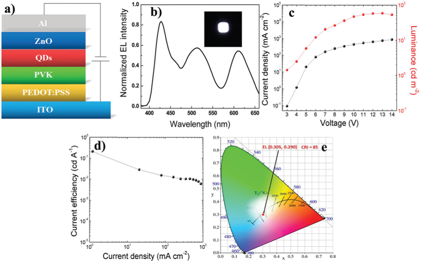 图2 铜、锰共掺杂Zn–In–S/ZnS量子点发光材料制备的高性能发光器件