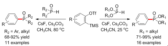有机磷化合物广泛应用于有机合成、材料、生物医药、配位化学、催化剂和阻燃剂等领域中。其中,芳基膦配体在过渡金属催化反应中发挥着不可或缺的重要作用。由于芳基膦配体价格昂贵以及其传统的合成条件较苛刻,因此,简易高效地合成芳基膦配体具有很大的挑战性。该团队在前期对高活性有机中间体--芳炔的反应研究基础上,发现芳炔在温和条件下可与亚磷酸二酯或二芳基氧膦以高产率生成芳基磷酸酯或芳基叔膦氧化物,反应使用的所有原料均廉价易得。其中,芳基叔膦氧化物可在温和条件下还原生成芳基膦配体。该研究发展了一种新型的芳炔反应方法学,并利用氘标记技术阐述了可能的反应机理,为制备取代的芳基单(双)膦配体以及手性芳基膦配体提供了基础。目前,该团队正在进行更深入的研究探索。