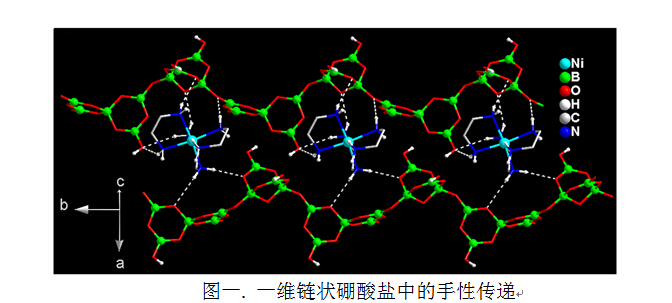 在课题组成员的共同努力下,通过协同模板作用,获得混合硼氧簇构建的一维链状硼酸盐:Hen ·Ni(en)3·[B4O5(OH)2] ·[B5O8(OH)2]。不同硼氧簇单元存在不同的pH至等条件下,并且带有负电荷,因此混合簇单元构筑的硼酸盐结构很不稳定。通过巧妙的引入多种带正电荷的模板剂,抵消了混合硼氧簇的多余电荷,实现混合硼氧簇的连接;研究发现在该物质中只存在Δ构型的Ni(en)3,Δ-Ni(en)3可以将自身的手性诱导在硼酸盐的链状结构。