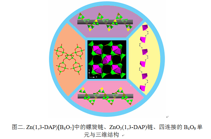 另外,该课题组通过尝试不饱和配位的金属有机基团与硼氧簇单元组装合成,获得了纯硼氧骨架单手性一维孔道硼酸盐Zn(1,3-DAP)[B4O7](图二);在硼氧骨架中,出现了左右手螺道; 而一维的ZnO3(1,3-DAP)链占据在左手螺旋孔道中,造成了极少见到的单一手性孔道,这种孔道的硼酸盐,系本课题组首次报道;单一的手性孔道既可做为通道储存,吸附或分离小分子;也可作为微观的反应场所进行手性催化反应;研究还发现,该物质热稳定性可以超过400℃,带隙约4.9ev左右,并且可以产生紫外发射光谱(Em=385nm)。这种具有多种优异功能的硼酸材料具有重要的应用价值。