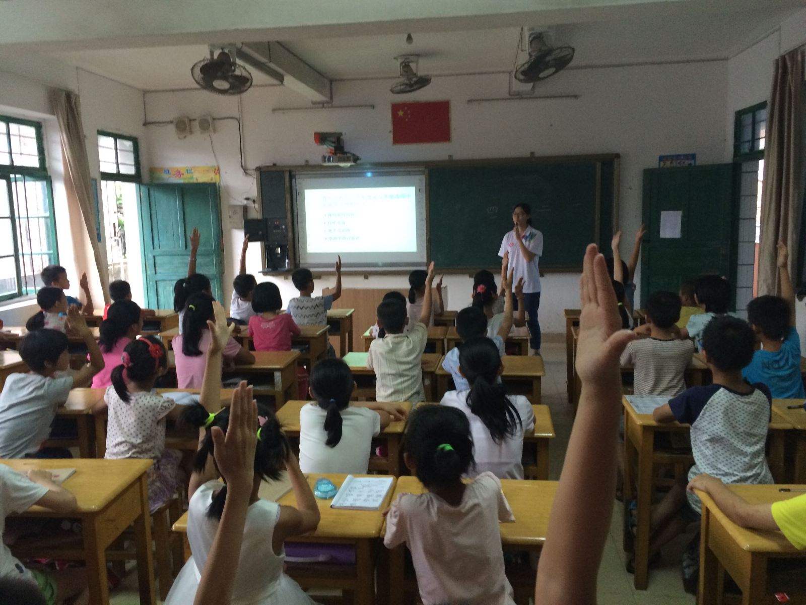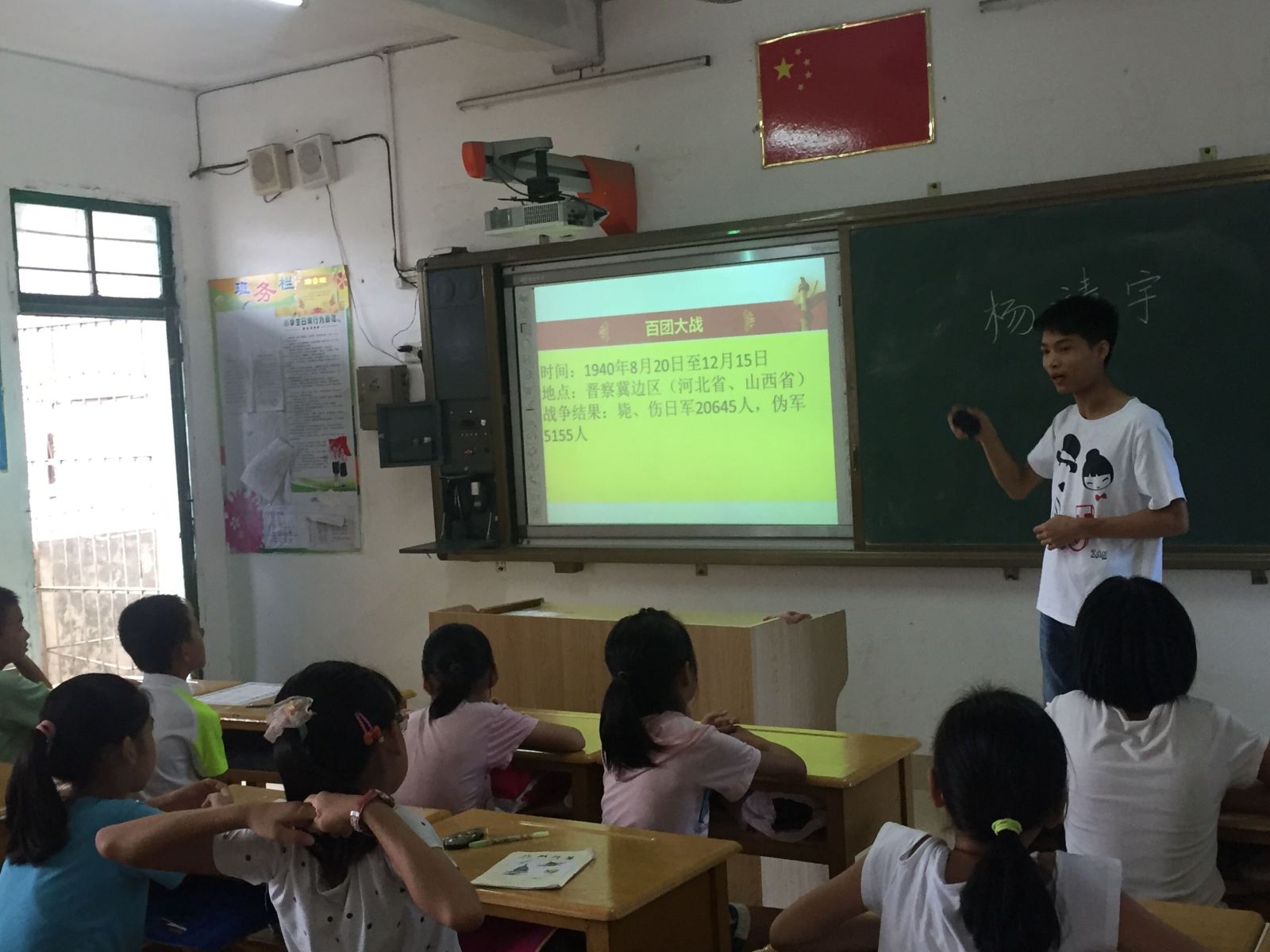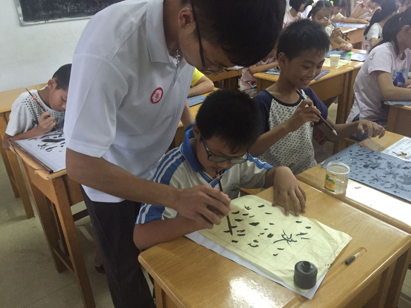 在自然科普课上,队员聂同学对暴雨、台风、雷电等自然气象灾害和相关预警知识进行普及,并列举当地常见气象灾害生动讲解,引导小朋友掌握基础自然常识并学会做好防范、加强自我保护。数学课上,林同学通过计算抢答的方式调动班级学习热情,并认真解析解题思路、技巧和易错点。语文课上,黎同学以《舌尖上的中国》讲述顺德美食为切入点,引导小朋友发挥想象、组织语言形容身边美食,系统地介绍了语言表达中形容词的丰富使用,很好地训练了大家的语言组织和表达能力,课堂氛围积极活跃。在书法课上,梁同学首先介绍了毛笔书法的历史和类型,接着耐心讲解正确的握笔方式和基础笔划的书写,最后教导大家认真练习,并希望小朋友们在学习书法的过程中,感知和传承中国传统文化。此外还有趣味英语课,教导大家学习发音和简单阅读;化学实验课,以“瓶子吹气球”、“烧不着的纸”等趣味实验带领小朋友体会化学奥妙;以及按兴趣分组开展的体育锻炼课,组织进行体能锻炼、乒乓球、下象棋等活动充……充实丰富的义教课程为小朋友们的暑期生活增添了许多精彩和欢乐。