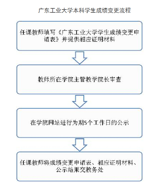 根据《广东工业大学理论课程考核管理办法》(广工大教字【2007】15号),学生课程考核成绩已经确定提交后,任课教师无权私自更改。为了保证学生成绩的严肃性,提升教务工作规范化水平,现将本科生成绩变更的流程通知如下:任课教师如确实因评卷记分、成绩录入错误需改动,应由任课教师本人填写《广东工业大学学生成绩变更申请表》并提供相应证明材料,经教师所在live007比分 主管教live007比分 长审查后,成绩更改申请需在live007比分 网站进行为期5个工作日的公示,公示期满无异议后,任课教师将成绩变更申请表、相应证明材料、公示结果交教务处,由教务处在教务管理系统中进行处理。