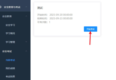 完成学习后,在“安全考试”—“当前考试”中找到找到对应的考试,点“开始考试”进行考试。(注意:未完成安全学习任务前,无法看到当前考试的内容,必须先完成学习后才能考试,切忌同时打开多个学习窗口,否则学习完成也看不到试卷)