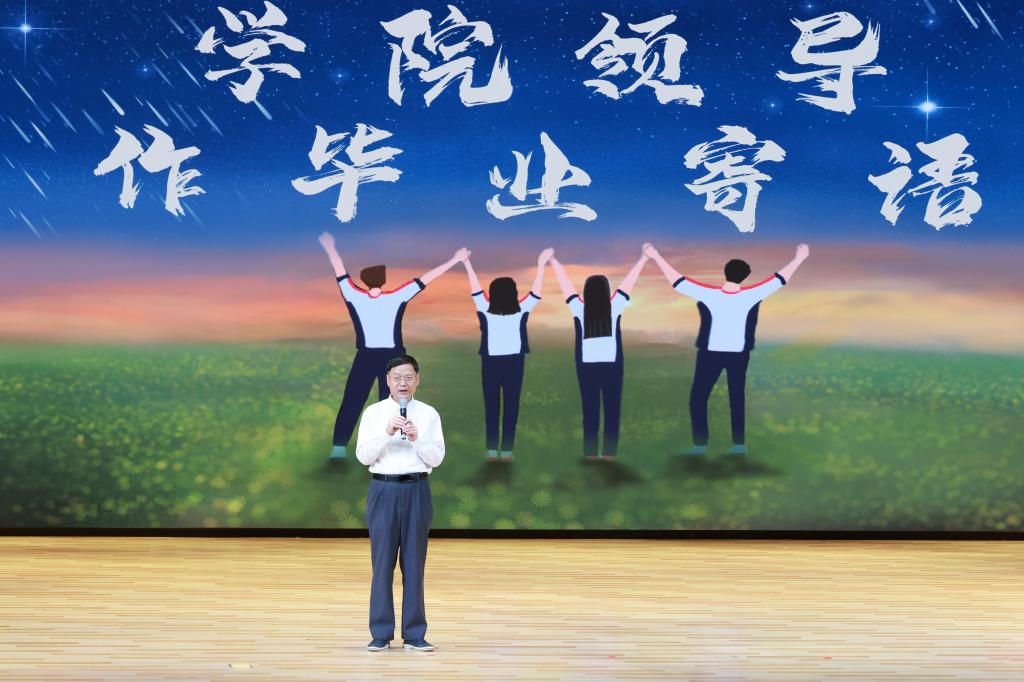在毕业祝福视频与精彩的《Maniac》开场舞蹈表演之后,徐向东代表两院全体师生向即将扬帆远航的毕业生们送上最温馨的祝福和最深切的寄语。他祝福毕业生们常念“学校永远是每位毕业学子温暖的港湾”,带着珍贵的大学校园回忆,奔赴璀璨的星海,开拓属于自己的未来;寄语毕业生们牢记“团结、勤奋、求是、创新”的校训,在工作岗位上为国家高质量发展、为建设社会主义现代化强国、为粤港澳大湾区发展贡献青春力量。