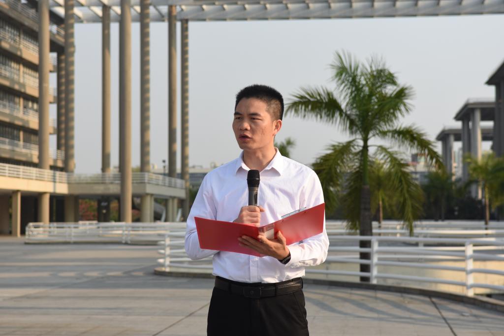 仪式结束后,杨刚老师作国旗下讲话。他首先表示,升旗仪式不仅在于表达对党和国家热爱、祝福,而且在于从祖国辉煌历史中汲取前行力量。随后,杨刚老师提出三点希望与同学们共勉:一是筑牢理想信念根基,怀爱国之情投身强国建设;二是坚守科创报国初心,以自强之志追求开拓创新;三是永葆昂扬奋斗朝气,乘时代发展之势勇攀高峰,与强国建设同频、与广东高质量发展共振,在新时代征程中跑出广工人的青春加速度。