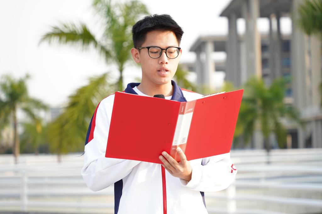 升旗仪式结束后,2024级学生代表李泽键同学作国旗下发言。他结合参与国旗护卫队、科研实验室以及担任班长的经历,号召同学们在大学期间甘于奉献,在团队协作中攀登高峰;砥砺奋发,在拼搏岁月中镌刻青春模样;脚踏实地,在勇于尝试的旅程中突破自我,争做德智体美劳全面发展的新青年,在新时代新征程中贡献青年力量。