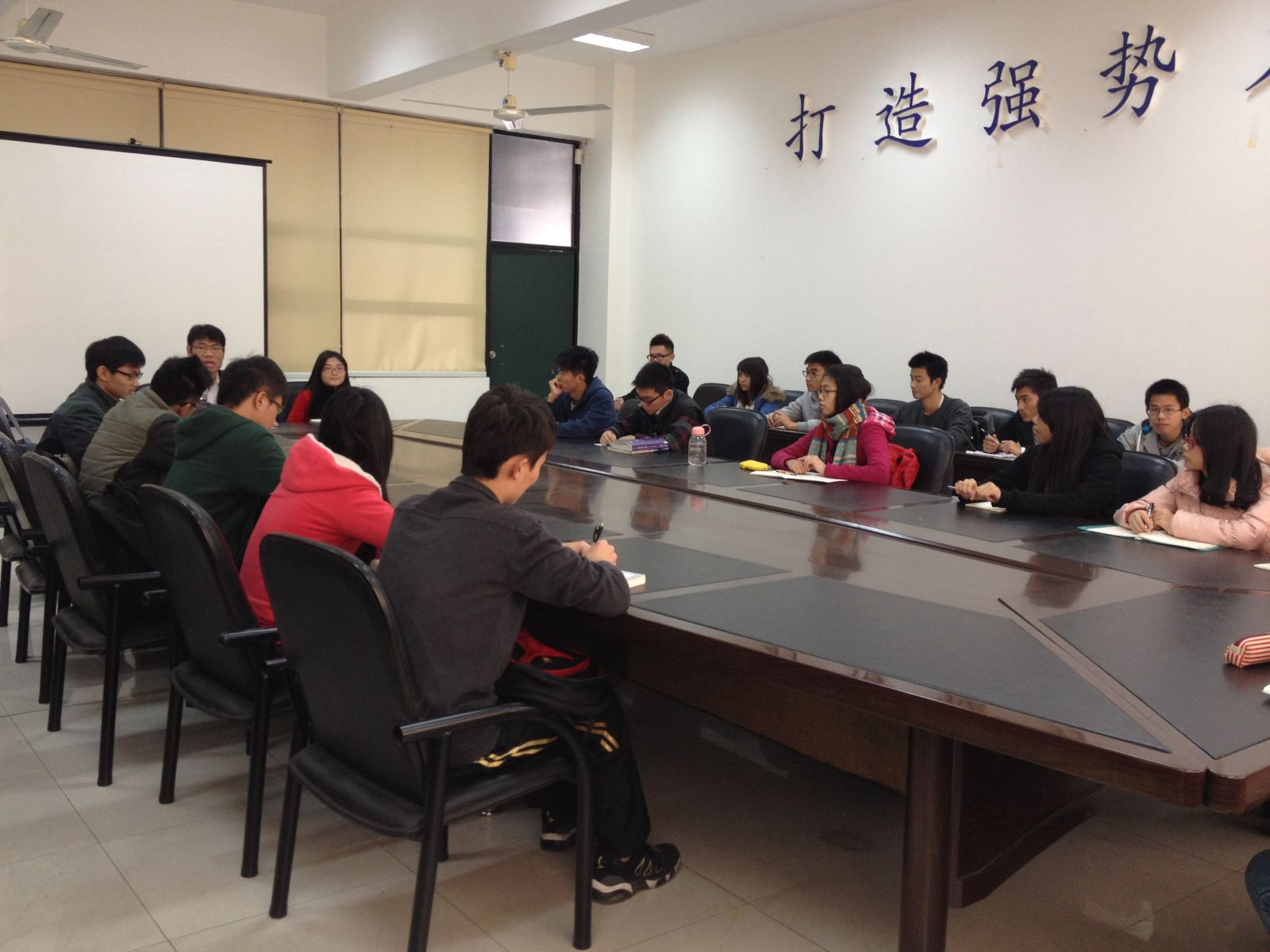 会上,郭亮对2013级本学期的班风、学风建设工作做了认真的总结,向班干部一学期来辛勤的付出表示衷心的感谢,同时也勉励大家再接再厉,争取取得更大的成绩。魏源布置了接下来的各项工作,1、班长要抓好班级的考风考纪教育,从严规范每一位同学的考试行为。2、本学期末及下学期初,各班要密切关注同学们的思想动态,心理健康情况,以宿舍为单位做好学生情绪异常情况的排查,发现问题及时上报。3、各班要提醒同学们注意寒假期间的人身及财产安全,特别是做好寒假留校学生的统计工作,尽可能的关心和关怀寒假留校学生。大家还就增强班级之间的相互交流和相互学习提出意见和建议。
