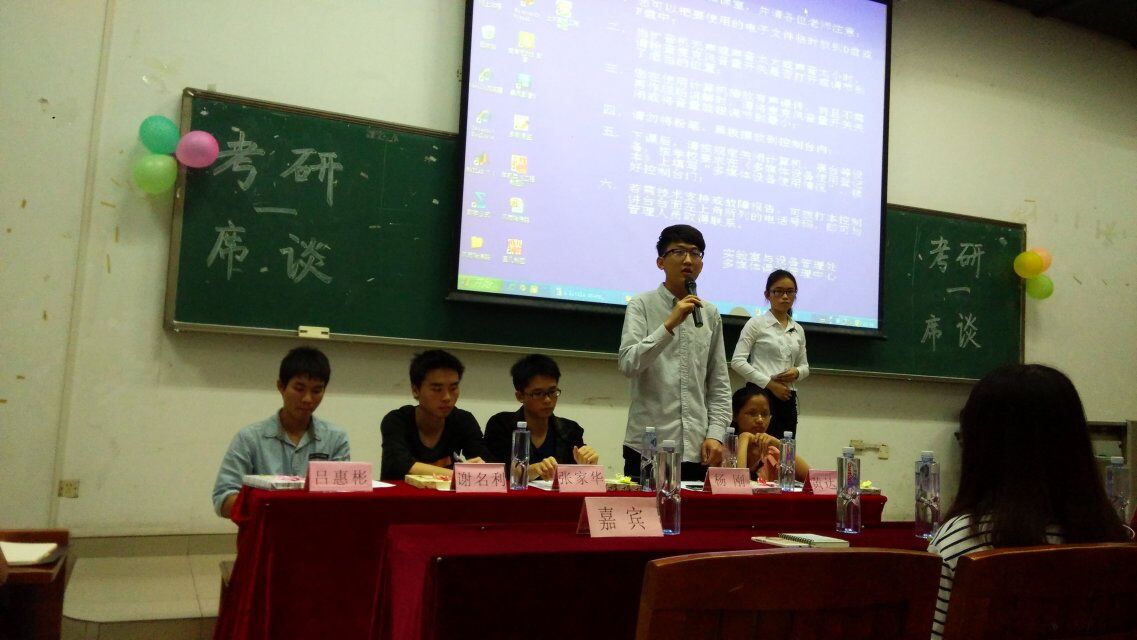 在活动的开始,主持人介绍了本次交流会的嘉宾和流程,随后各位嘉宾轮流做精彩的发言,师兄师姐的发言处处紧扣大家关注的问题,台下的同学们认真记录和思考,活动现场气氛融洽。一方面,保研的师兄师姐们针对保研条件、如何申请保研及保研过程进行经验的分析,另一方面考研的师兄们则主要针对考前各科的复习方法和时间的合理安排进行了总结和分享。