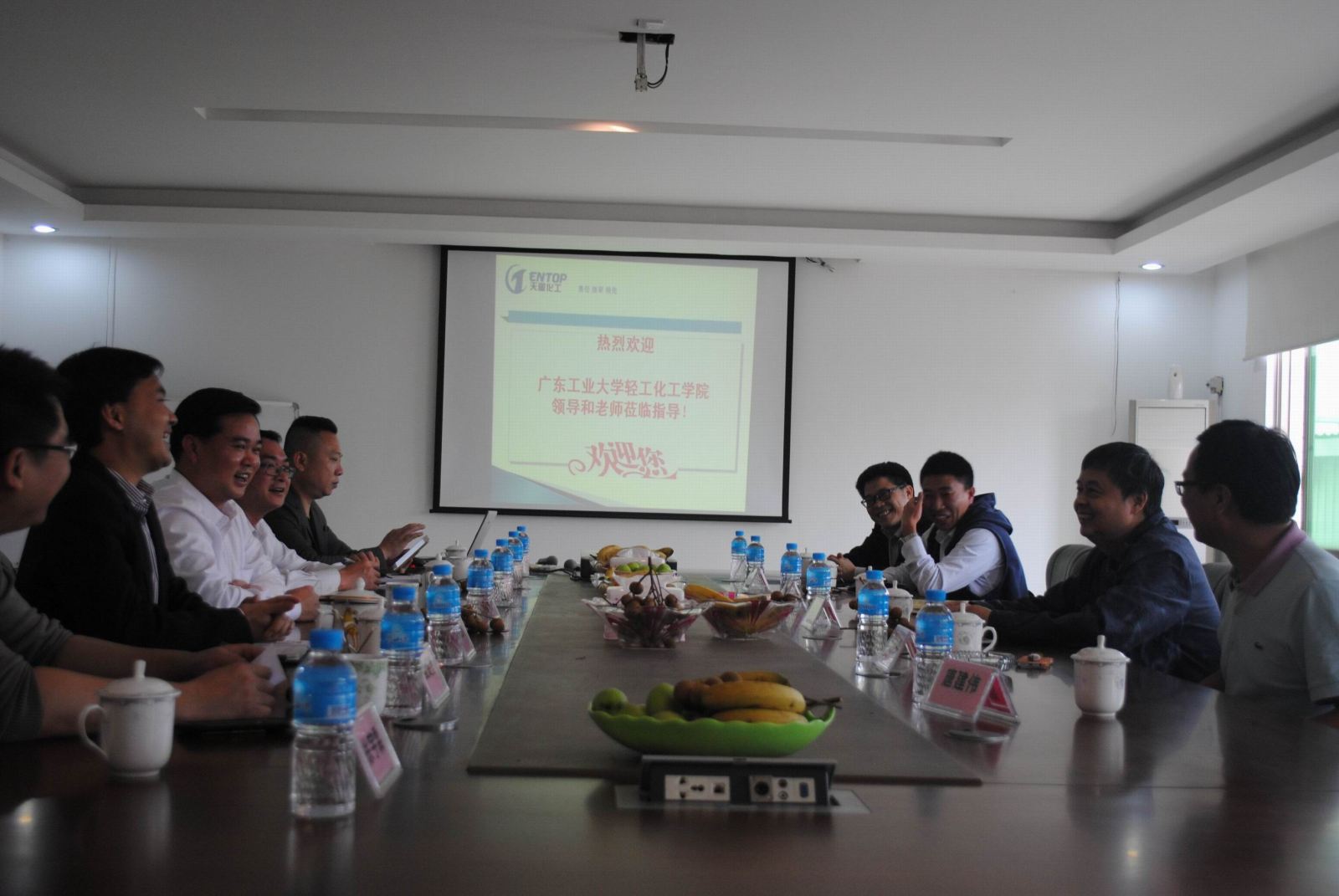 在方岩雄院长的带领下,live007即时比分 领导、老师一行5人于下午14:00来到了位于中山市三角镇的中山市天图精细化工有限公司,受到了该公司谢志平董事长及温俊凡、梁高健等公司领导的热烈欢迎。挂牌仪式前,谢志平董事长等公司主要领导分别从公司的成立和成长、公司的产品和生产研发以及公司的社会责任和发展愿景等多个方面向我们全方位地介绍了天图精细化工有限公司,让我们对天图精细化工有限公司有了更加深入的了解。方岩雄院长、杜志云副院长等代表live007比分 表达了对天图公司支持live007比分 产学研究和人才培养的衷心谢意,并分别从学科特色、科研队伍、人才培养等多个方面向天图精细化工领导们介绍live007比分 ,另外,还从我校积极参与高水平大学建设给live007比分 及企业带来宝贵发展机遇的高度展望了未来的校企合作。会谈气氛热烈,校企双方共同表达了进一步加大联合培养创新开发型人才的力度和拓展科研合作深度、广度的良好愿望。