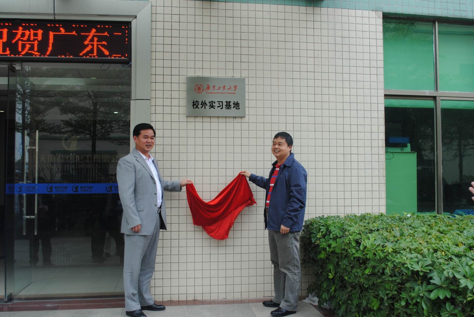其后,方岩雄院长和谢志平董事长代表双方共同举行了“广东工业大学天图精细化工有限公司实习基地”挂牌仪式,拉开了校企联合培养人才新的序幕。