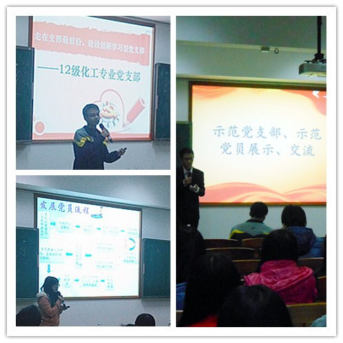 在示范党支部、示范党员分享交流环节,12级化工党支部书记叶铭书同学作为党员代表发言,他以精美的ppt展示本年度支部工作情况及个人的成长收获。叶同学作为示范党员代表,其负责的支部也荣获全校“学风建设优秀学生党支部”荣誉称号。这一年,他与各位支委分工明确、执行到位,带领全体支部成员努力创建学习型党支部,共同取得优异成绩。应化11级(1)班党支部卓少春同学、12级生物党支部邓晓丽同学,也作为示范党员代表总结、分享一年来自身生活、学习、思想各方面的成长变化,呼吁在座党员积极参与示范党支部、示范党员的申报工作,以榜样身份严于律己,充分发挥模范带头作用!