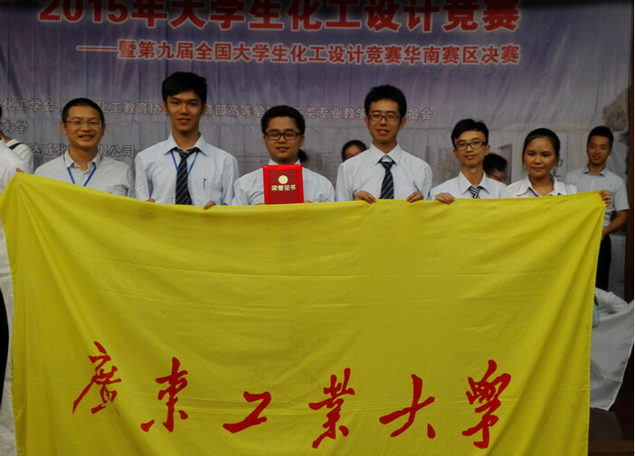 近日,2015年第九届全国大学生化工设计竞赛在天津大学落下帷幕,报名参加本届竞赛并提交作品的高校共有238所920支参赛队伍。由叶飞、张维刚和杨楚芬老师共同指导的广东工业大学“C5”团队(吴统秋、陈超浩、陈晓媛、刘杰荣和朱培元)代表我校参加竞赛,获得全国二等奖、华南赛区一等奖。