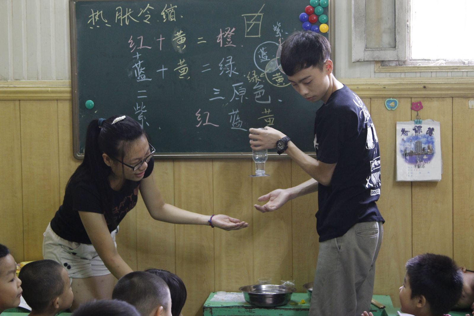 作为化工专业出生的学生,我们也开展了一系列的趣味实验课,包括三原色、热胀冷缩原理还有纸片托水瓶的实验,奇妙的实验现象引起小朋友们的一阵阵欢呼,我们将一些科学知识传授给他们,希望对他们有一点点启发。