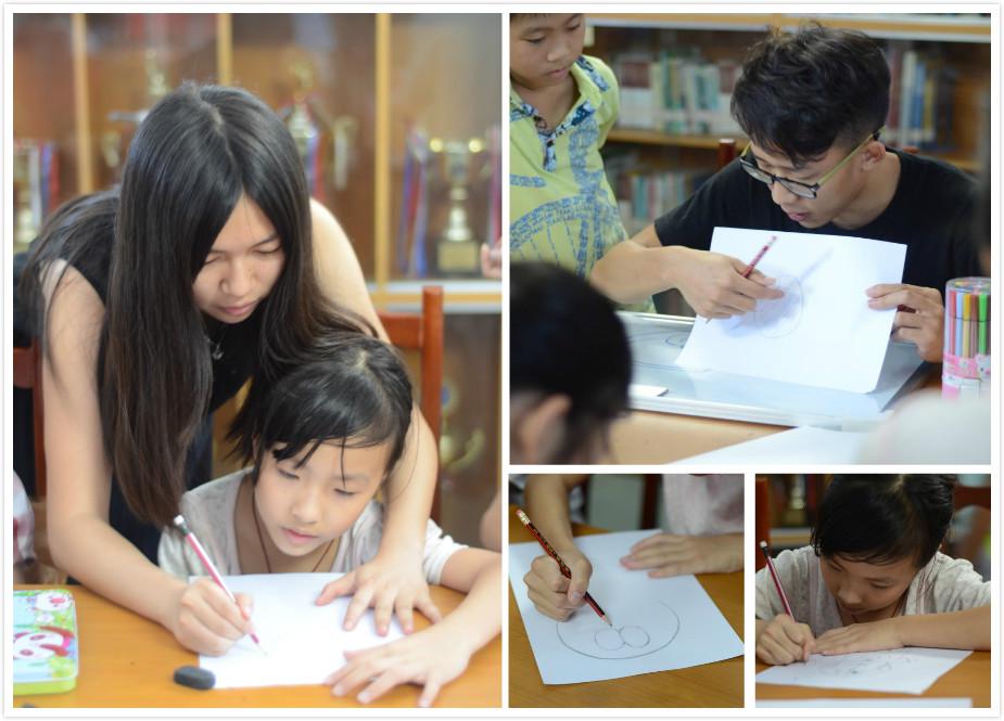 女孩子们喜欢细腻的有趣的游戏,队员们为此准备了萌萌哒的绘画教程,教给她们基本的绘画基础,将哆啦A梦、海绵宝宝、小黄人等深受喜爱的动漫形象以简单的轮廓组合起来,再稍加修饰、修改,萌萌哒的形象就出现在各位小同学的画纸上。