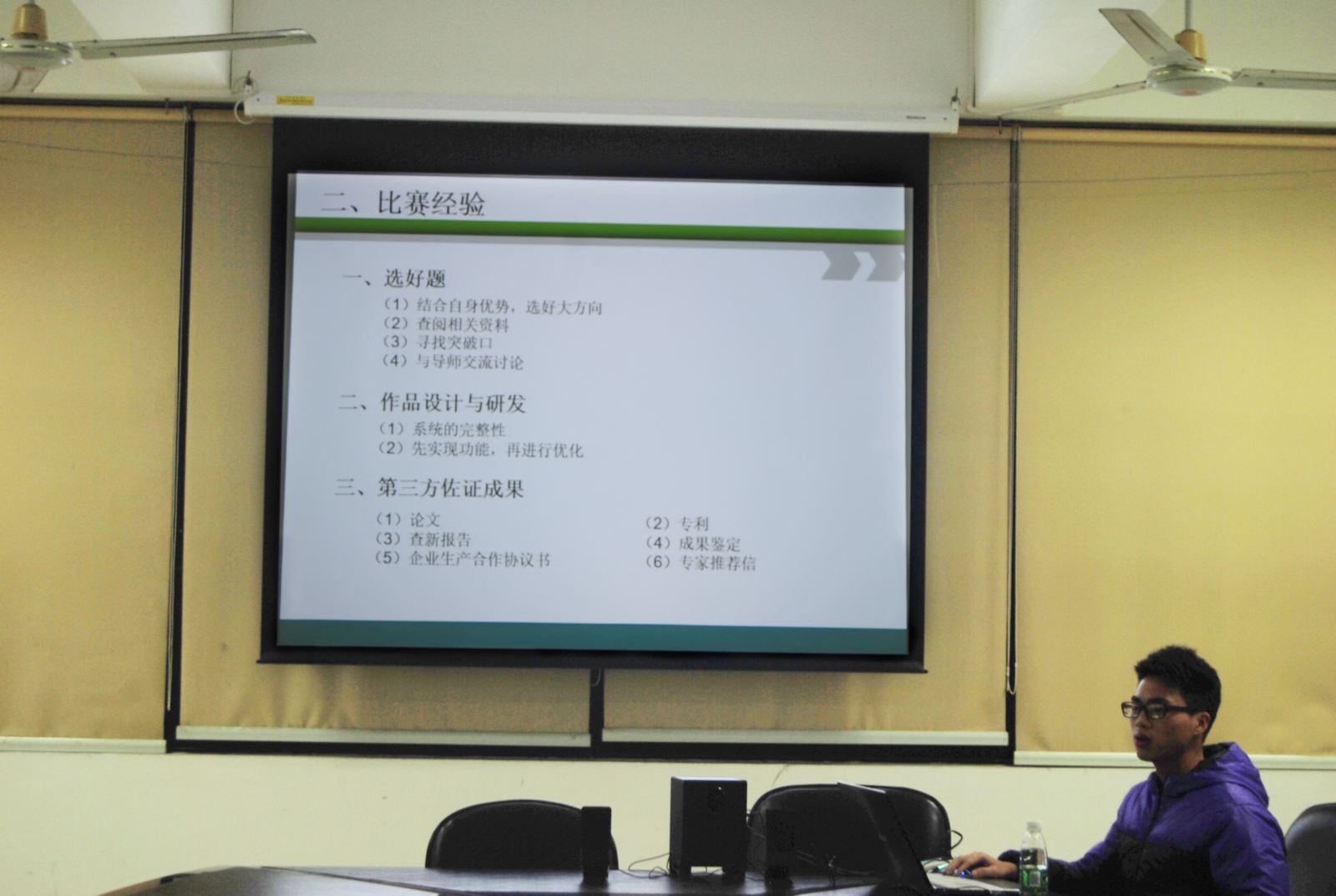 继live007即时比分 第八届“创青春”学生创业大赛动员大会之后,live007即时比分 于12月17晚在工三220举办了创新创业系列活动第二讲——“挑战杯”经验交流会。第十四届“挑战杯”国赛荣获特等奖的参赛团队核心成员康嘉文分享了他在参赛过程中的心路历程和经验感悟。