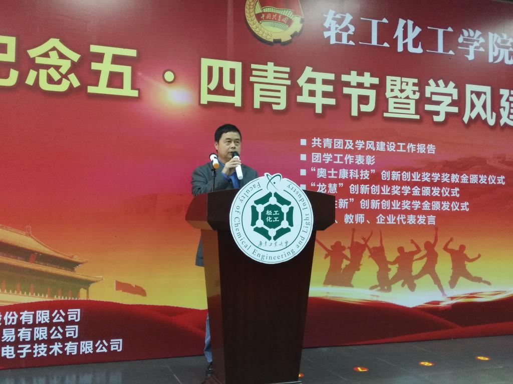 优秀教师代表罗洪盛老师分享了指导大学生创新创业项目的心得和收获,他勉励同学们珍惜和平、安定的环境,以弘扬 “爱国、进步、民主、科学”的五四精神,积极投身科研。
