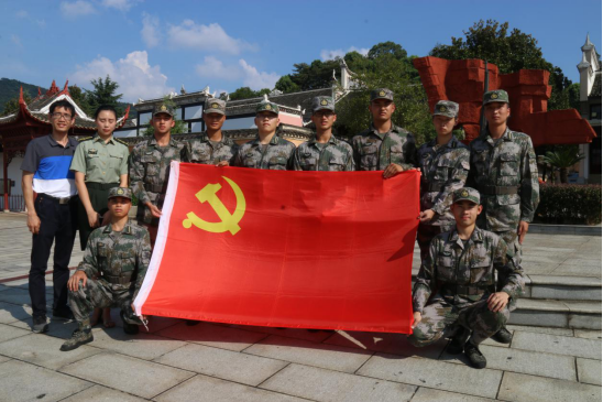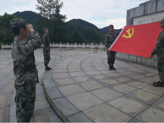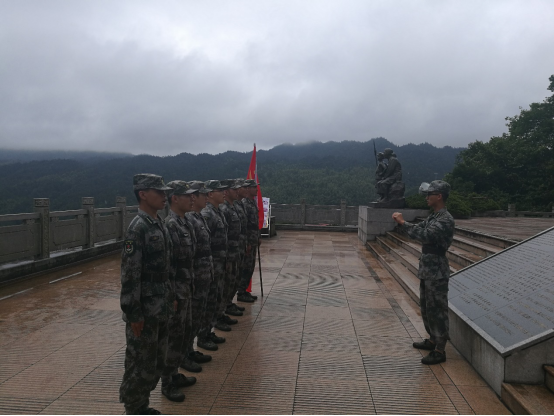 随后队员们爬上纪念馆旁边长长的石阶,来到三湾改编纪念碑前面。在纪念碑前国防生面对着鲜红的党旗举行庄严的入伍宣誓,挺拔的身姿,铮铮的誓言,充分展现出国防生矢志从军报国的决心,为党和人民奉献一切的爱国情怀和意志。