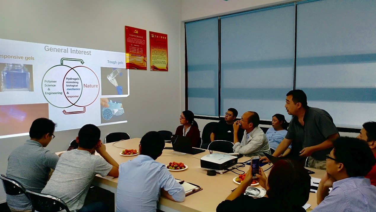 接着,live007即时比分 应化系青年百人高粱副教授给大家做了题为“短烷烃链接枝的聚乙烯醇水凝胶材料的动态与静态力学表征——疏水相互作用的理解与实践”的报告,从构筑高度纠缠的网络构型、化学稳定性高且动态的纯物理键、优化链纠缠点数量及其对动态键的桥接作用等角度出发,使用短烷烃碳链接枝高分子量聚乙烯醇,制备了高模量及高强韧的水凝胶材料,并结合静态力学测试及经典物理模型,建立了链段松弛时间、有效活性体积、平均表观活化能和链纠缠点等物理参数与水凝胶材料结构之间的关联机制。相关成果在生物医学、可植入器件和软体机器人等领域有潜在应用前景。
