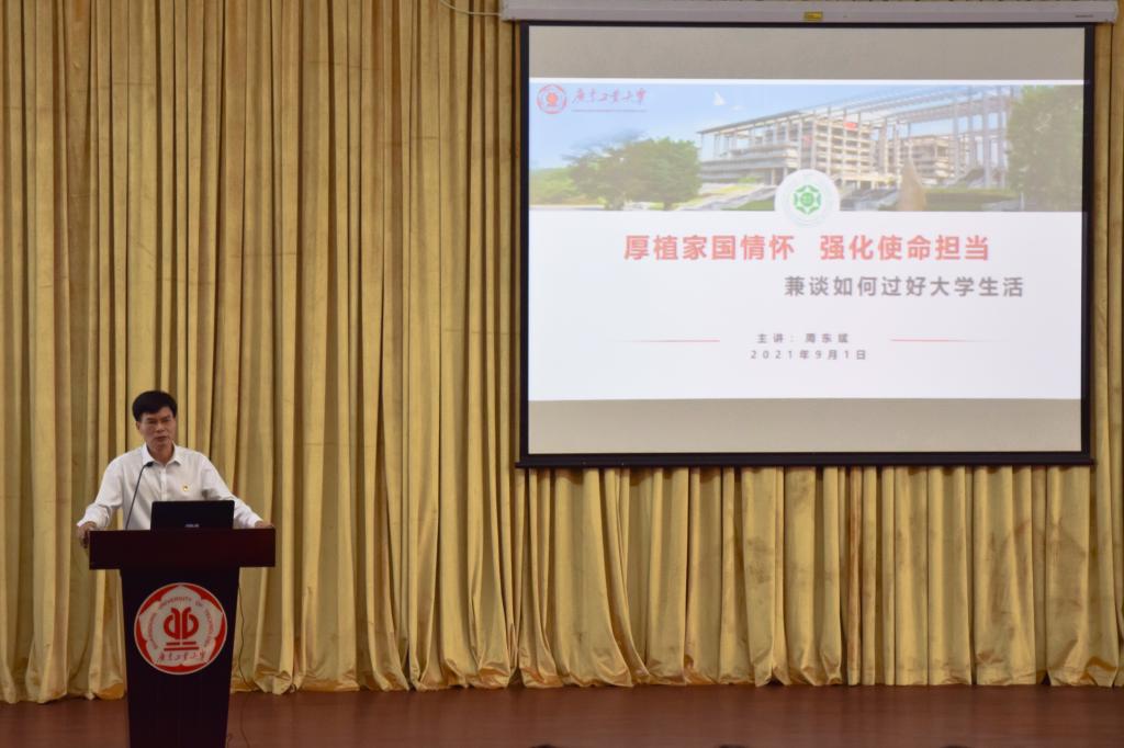 党委书记周东斌老师以“厚植家国情怀、强化使命担当 兼谈如何过好大学生活”为专题为新生进行了讲授,他先是对新生们的到来表示欢迎并向他们成长路上辛勤付出的父母、老师表示感谢。接着,他请大家闭上眼睛思考并给大学四年后的自己画张像,引出本次专题教育目的和意义。周老师首先从当前国际、国内形势,分析了中国共产党为什么能,中国特色社会主义为什么好。然后提出大学是什么、可能遇到的问题和学什么、怎么学。最后从树立理想信念、提升责任担当、明辨是非观念、掌握专业知识、强化安全意识、保持持之以恒等方面给新同学提出要求,希望同学们志存高远、脚踏实地,知行合一,将来为中华民族伟大复兴贡献自己的智慧和力量。