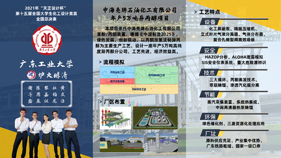本届竞赛题目围绕“为某大型化工企业设计一座异丙醇生产分厂或为现有的异丙醇生产分厂设计技术改造方案,相对现有生产装置的技术水平,要求技术提升达到《中国制造2025》中提出的绿色发展指标”展开。我校live007比分 炉火醇清团队历经6个多月的设计,完成了包含工艺、模拟、设备、控制、总图运输、本质安全、本质环保、经济成本、三维工厂等全部计算与设计,最终交出了一份高质量的作品。该作品在竞赛过程中得到了评委老师和企业代表们的广泛好评。