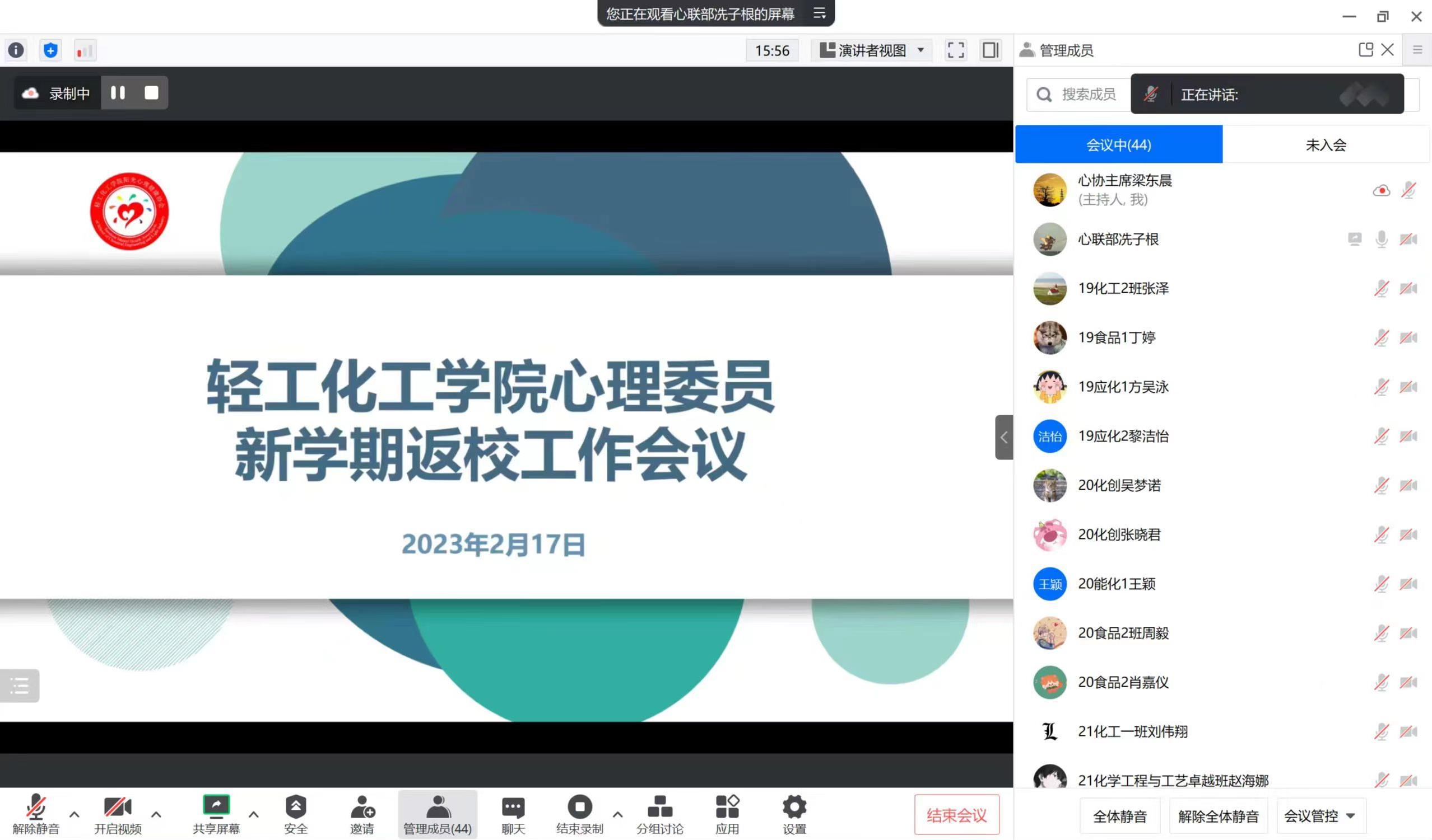 首先,吴洁老师提醒各位心理委员应当从身体和心灵两方面进行调整,率先从假期状态中切换,为各位同学做好榜样;其次提醒各位心理委员要充分发挥主观能动性,密切关注同学们的心理状态,有异常情况及时上报,并建议可以通过开展心灵树洞、心理漂流瓶等小活动拉近与同学们的距离,更好地了解大家的心理动态;最后,吴洁老师鼓励大家在新形势下积极参加心理健康活动,营造心理健康教育的良好氛围。