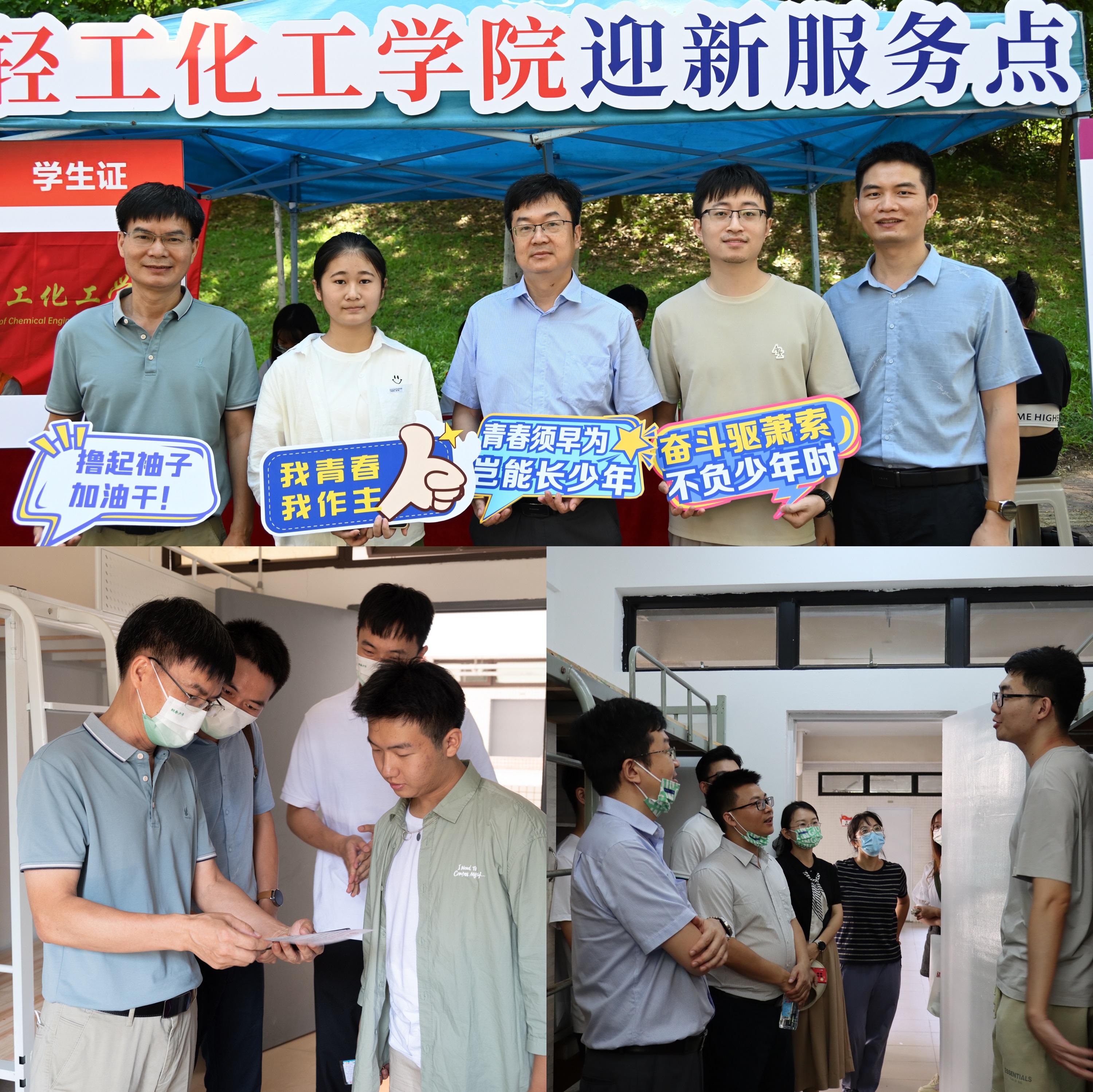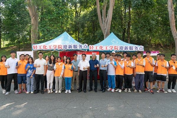 领导老师和参与迎新工作的同学早早来到迎新服务点,整装待发,静候“小轻新”的到来。