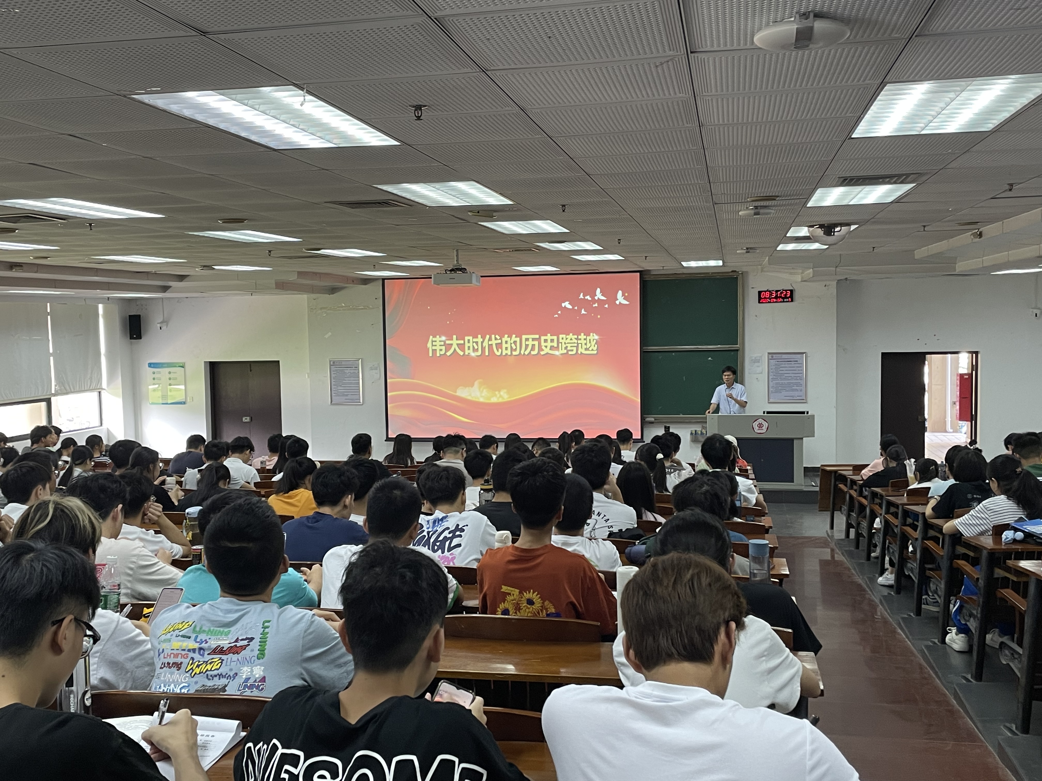 党委书记周东斌老师以《伟大时代的历史跨越》为题,从新时代有新作为新成就、用好“有利条件”走好“必由之路”、寄语青年等三个方面向同学们讲解了新时代党和国家事业取得的历史性成就、发生的历史性变革,希望同学们能够勿忘昨天的苦难辉煌,无愧今天的使命,担当不负明天的伟大梦想。他结合学校当前正在全力推进“1+2+3”攀撑计划学科提升工程建设,希望同学们与广大师生一道,主动参与,共同为学校的发展贡献力量。最后,他勉励同学们要坚定理想信念,厚植家国情怀;自觉遵纪守法,涵养高尚情操;建设优良学风,励志成长成才。