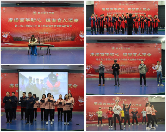 表彰结束后便是新年联欢会,联欢会以歌颂祖国为主线,把教书、育人、研究工作点滴融入其中,充分展示了教职工多姿多彩、积极昂扬、锐意进取的精神风貌。实验中心首先带来自编自导的《中年阵线联盟》和《实验室安全阵线联盟》,充满活力的抖音舞蹈瞬间点燃了全场热烈的气氛,拉开了联欢会的序幕。基础教学中心《万疆》的舞蹈把中国的故事娓娓道来,让人忍不住感叹祖国的伟大。化工系用建党百年音乐剧《悬崖之上》致敬牺牲在黎明之前的先烈们。食品系《Panama》健身舞再次沸腾了整个舞台。院办老师表演的《葬心》舞姿优美,把大家带入“多少无奈多少愁,终化相思葬心头”的意境中。能源化工系老师演唱的《光阴的故事》让我们再度回忆起精彩纷呈的青葱岁月。基础教学中心带来的古筝独奏《雪山春晓》,仿佛让我们置身雪域高原,看到春天到来时,冰雪融化、万物复苏,一派生机的景象。食品系的诗歌朗诵《我的祖国》激情澎湃、气势恢宏,充满了浓浓的爱国情。院办带来的歌舞串烧,用轻快的音乐和欢快的舞姿让现场变得轻快活跃。挥舞着手中的国旗,应化系带领全场老师在歌曲《我和我的祖国》中带入联欢高潮,用雄亮的歌声唱出对祖国的深情和祝福。期间主持人穿插抽奖环节,增添了激动人心、祥和喜庆的氛围。