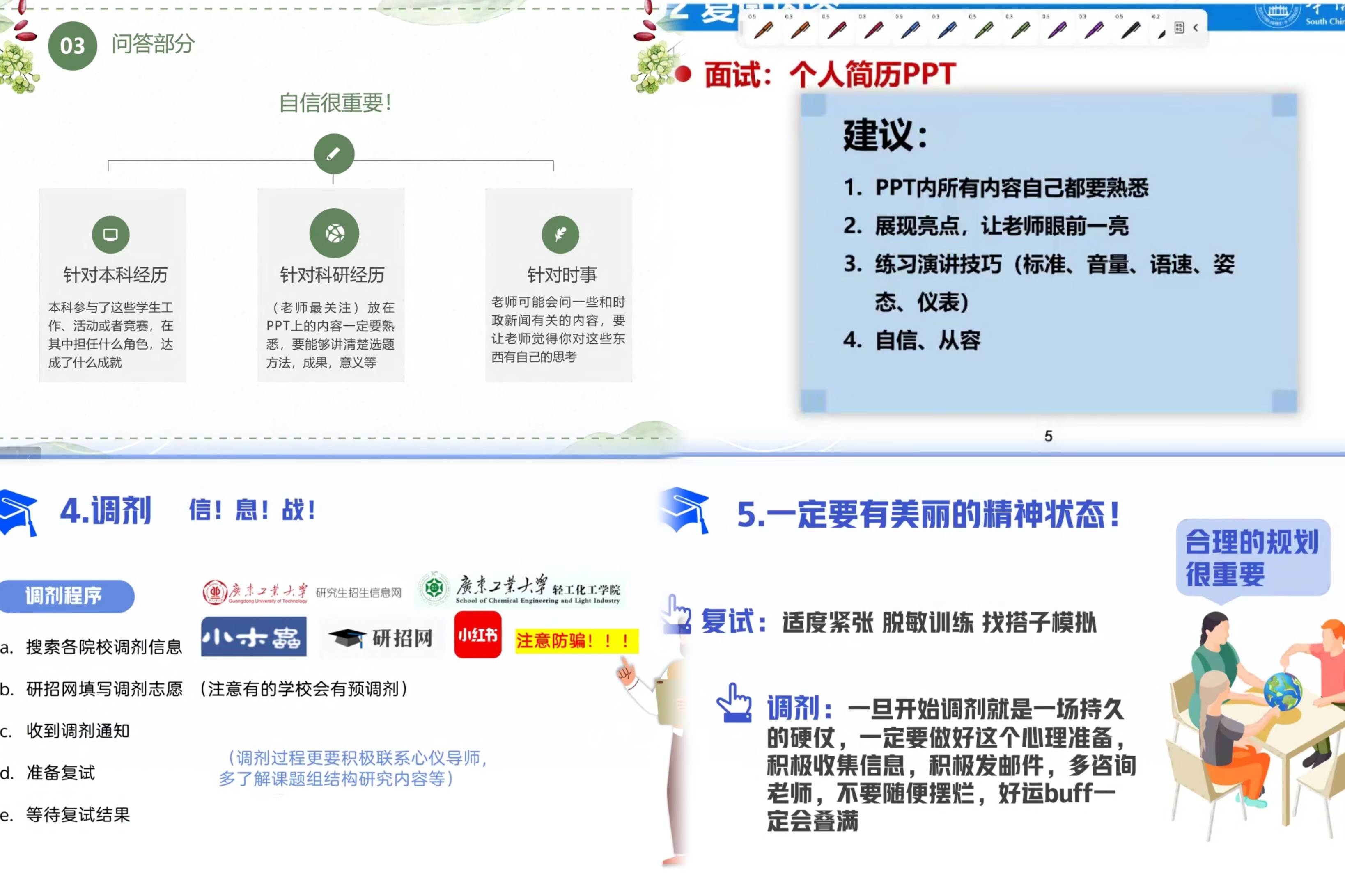 雷凯森同学着重分享了面试答辩的技巧,他建议在复试前要注重日常积累,加强练习演讲,充分做好专业知识储备;复试时要保持着装干净自信从容地向面试官展现良好的精神面貌。
