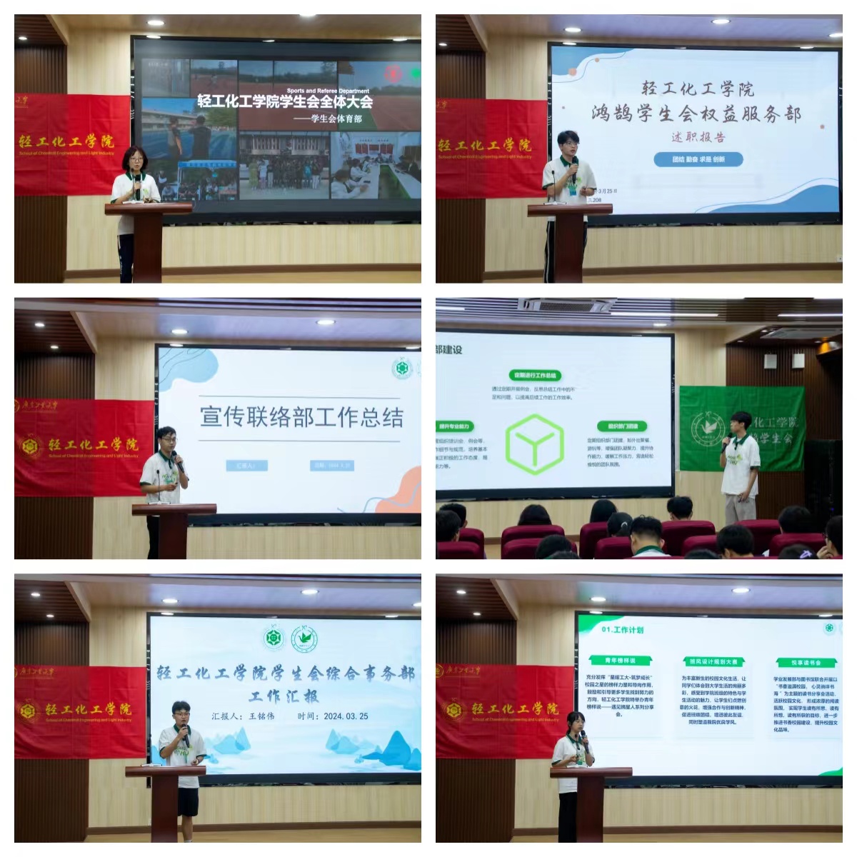 会议伊始,学生会体育部、权益服务部、宣传联络部、文娱部、综合事务部、学业发展部依次述职,向大家梳理各类活动已取得的成果,并结合本学期的特色项目,从工作重心、活动形式、团队建设等方面详细地汇报本学期的工作计划,“四球”班级联赛、毕业晚会、青年榜样说——遇见摘星人系列分享会、十大提案、班风设计规划大赛、翻阅前辈“人生的书”、解忧杂货铺、鸿鹄仔社区值班服务等活动的进展,强调坚持全心全意为同学服务的工作宗旨