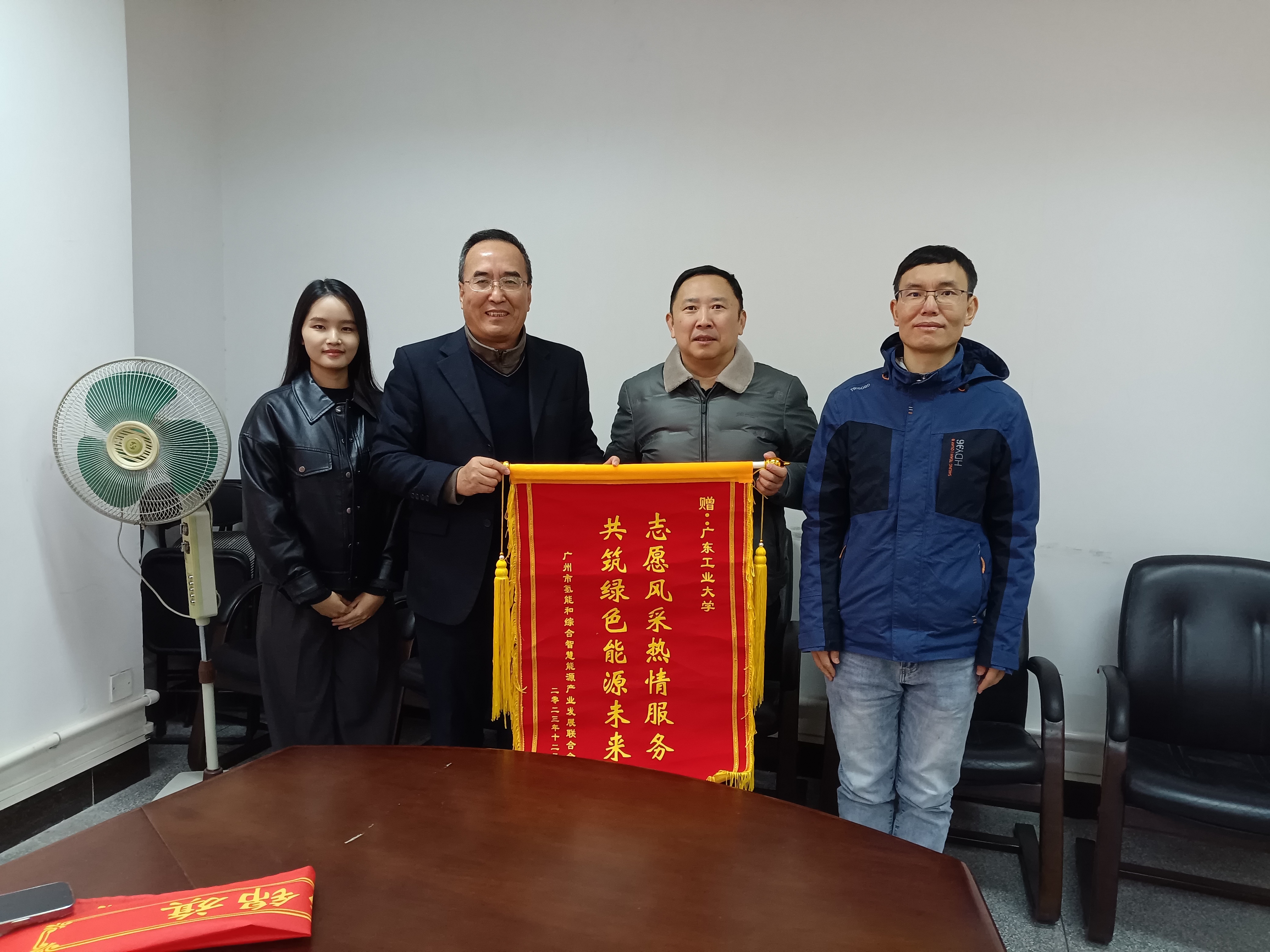 组织了16位本科生(氢能微专业)及相关方向研究生参与到本次大会的志愿服务中,为大会的顺利开展贡献一份青春力量。志愿者们身穿蓝色马甲,始终坚守岗位,在签到组、物资组、接待组和机动组尽职尽责,用心用情服务。志愿者们熬夜加班至凌晨两点,协助主办方如期完成了会议材料准备工作,工作表现获得了主办方的高度肯定和与会嘉宾的交口称赞。12月23日上午,广州市氢能和综合智慧能源产业发展联合会执行会长宋中林、项目部经理李育潞一行代表大会主办方为志愿者们送上书写着“志愿风采热情服务,共筑绿色能源未来”的锦旗以表感谢。live007比分