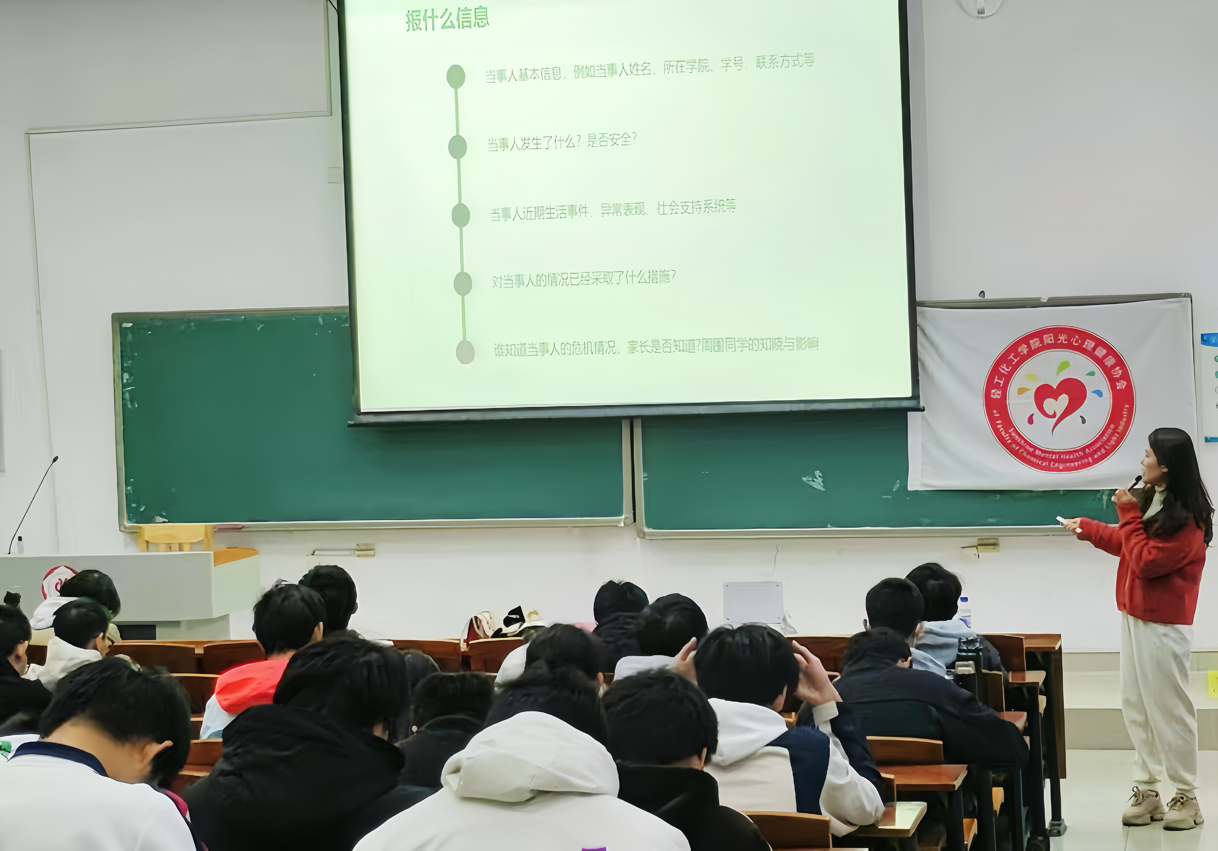 吴洁老师从宿舍信息员需收集的信息,宿舍信息员需重点关注的人群及宿舍信息员的工作原则三个方面来开展宿舍信息员培训。首先,吴洁老师从情感、躯体、行为、认知四个方面讲解了宿舍信息员们需要收集的信息,并强调不能忽视每一个细节,不放过每一个潜在的求救信号。接着,吴洁老师对在座的信息员们提出问题:宿舍信息员需要重点关注哪些人群,引起了同学们深度思考和讨论,之后吴老师给出了六个答案:经常出现情绪困扰、行为异常的同学,表现突然异于常态的同学,患有严重生理、心理疾病的同学,学习困难的同学,陷入情感危机的同学,经济困难的同学。最后,吴洁老师指出了宿舍信息员工作的两大原则—“尊重”和“共情”,宿舍信息员需要用心用情开展相关工作,为培养宿舍成员的健康心灵、守护同学美好未来和营造愉快健康的氛围发挥自身作用。