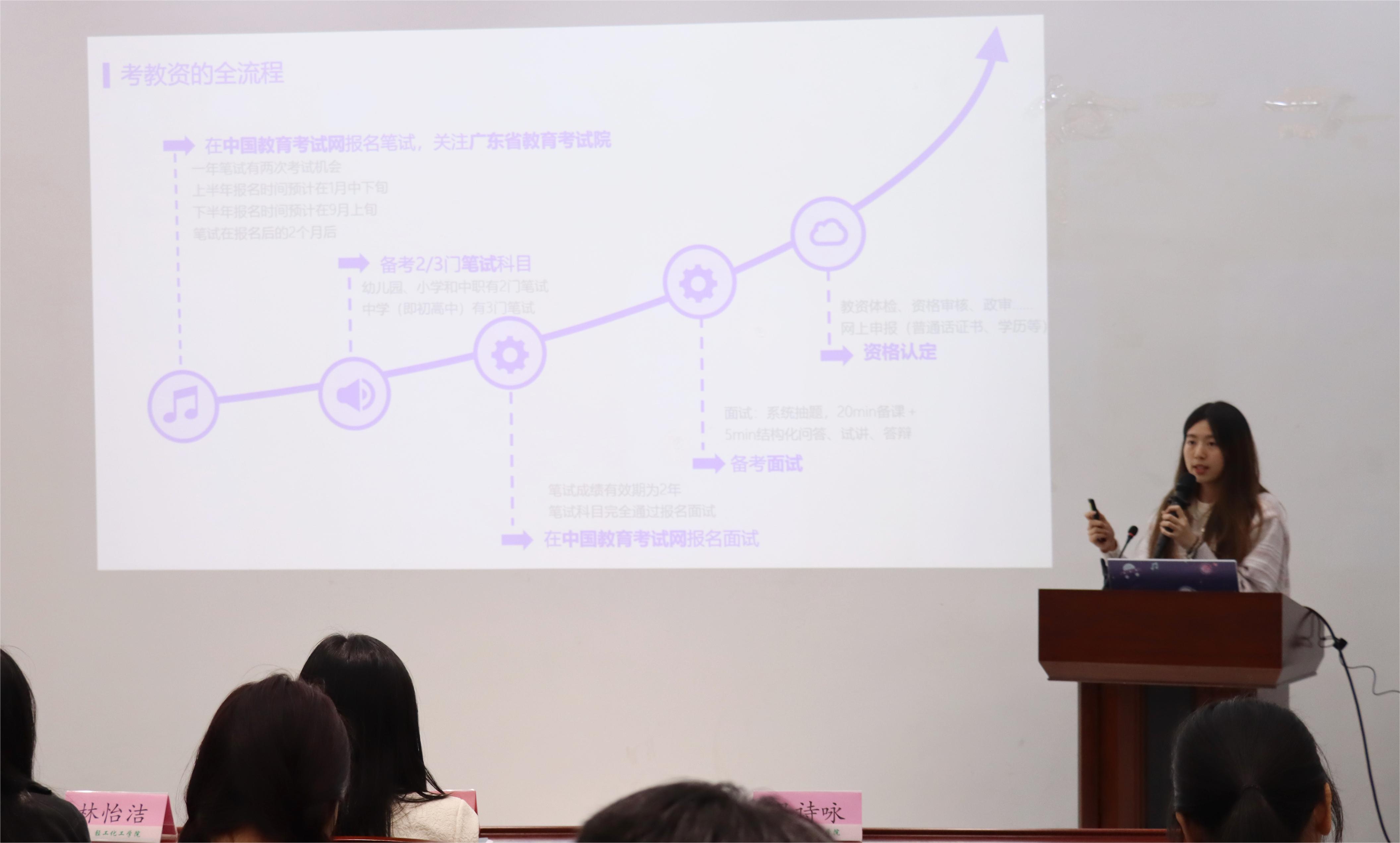 “在备考面试阶段,要熟背教案模板、动笔书写教案,尽可能把导入做得更加生动,提升板书的干净整洁性。平时建议大家通过对镜练习、录视频等方式模拟“无生”试讲场景,定期总结及调整试讲仪表及动作,增强课堂表现力”,林怡洁同学则重点剖析了结构化问答的题型及面试备考技巧,并建议同学们在备考笔试时要善于运用思维导图梳理知识点框架。