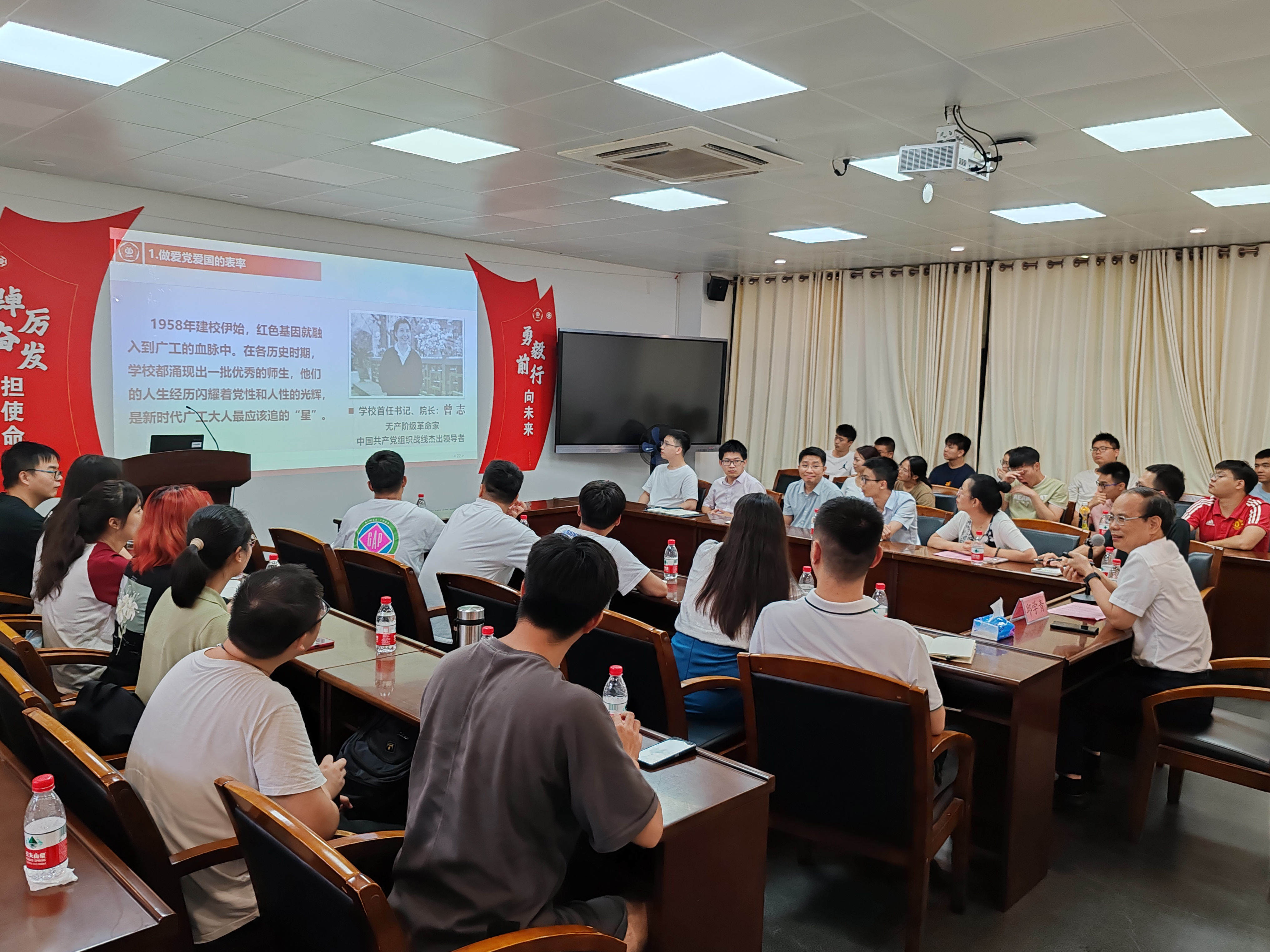 邱学青简要阐述了中国式现代化建设面临的挑战,并结合学校本科办学65年来的跨越式发展历程,讲述奋进中的广工在粤港澳大湾区建设和广东制造业当家的重大机遇下,全力推动实施学校“1+2+3”攀撑计划学科提升工程,加强人才培养、科学研究、社会服务和文化传承,肩负起新时代大学的使命。最后,他结合学校发展过程中涌现出的广工人最应该追的“星”:首任党委书记、院长曾志同志、“时代楷模”东深工程建设群体、斩获CUBAL全国总冠军的广工男子篮球队等,强调广大学子要做爱党爱国爱校、团结奋斗、求是创新的新时代好青年,做新时代的攀登者、奋斗者,为把广工建设成为“支撑粤港澳大湾区发展,工科特色鲜明,极具创造活力,世界知名”的高水平创新型大学贡献力量。
