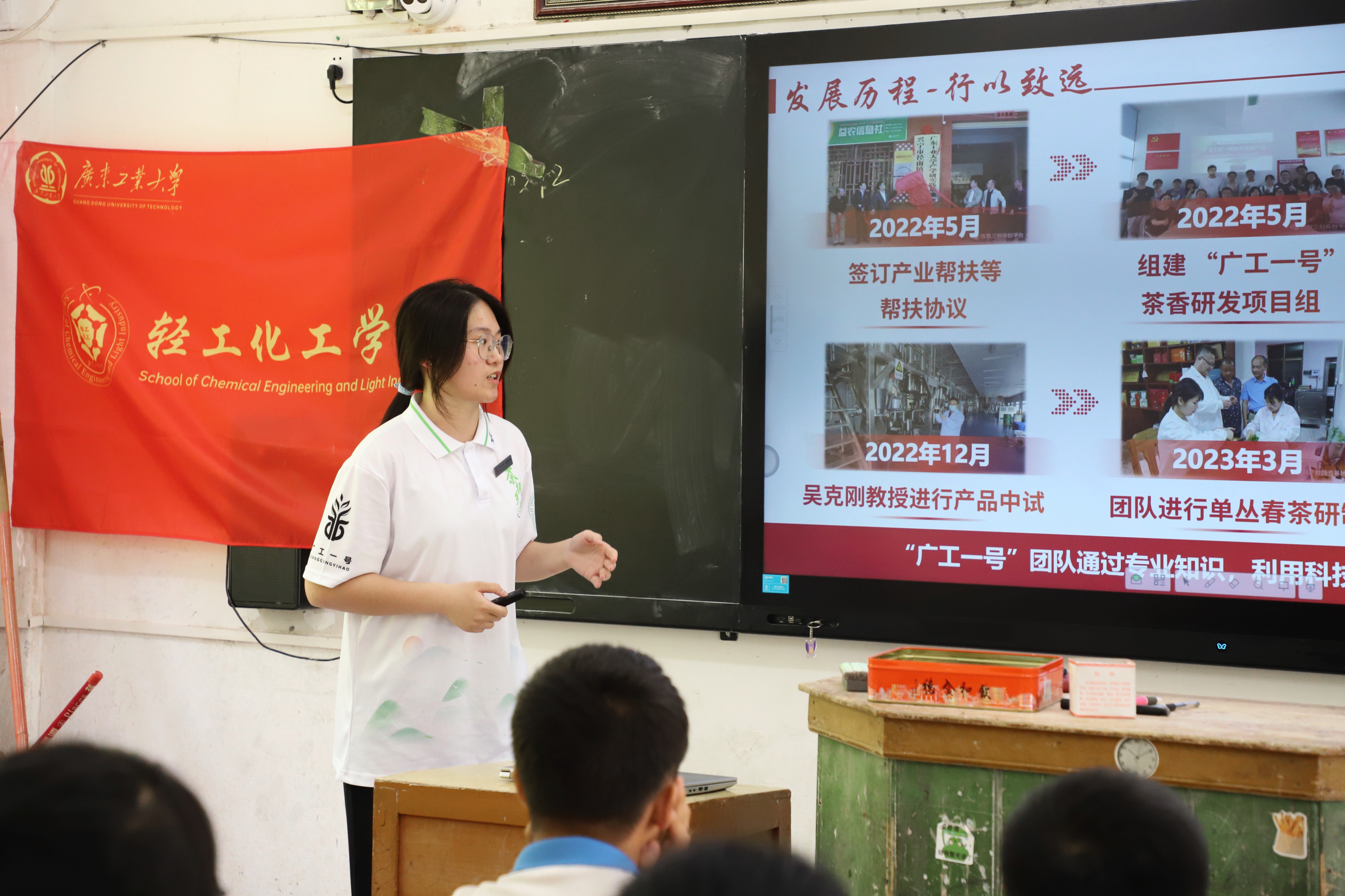 7月25日上午,突击队在径心中学开展“团聚径南学子,助力乡村振兴”主题宣讲会,倪银萍以“专业知识促进乡村振兴”为分享主题,围绕自身参加“广工一号”茶香研发项目团队的经历,分享了如何结合自身专业知识助力乡村产业振兴。她提到:“去年通过调研发现兴宁单丛存在夏茶苦涩、附加值低等痛点,‘广工一号’项目团队积极探索兴宁单丛的新产品开发和精深加工利用,提出春季制茶叶、夏季制袋泡茶、秋季制浓缩茶、冬季制奶茶粉的产业发展规划,用高校的科技优势赋能乡村茶产业振兴”,在课堂中还为同学们开启了食品知识科普小课堂,向同学们介绍了“冷后浑”“茶乳酪”等原理。同学们纷纷表示未来希望报考心仪的专业,努力拼搏,学以致用,以青春力量回报家乡。