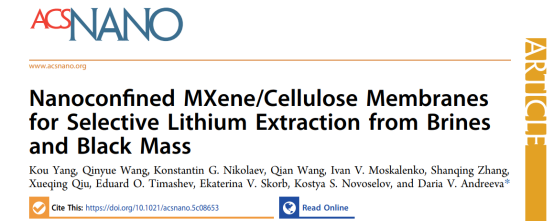 近日,我校诺奖得主联合实验室在利用二维材料从盐湖卤水与废旧锂电池中高效提取锂资源的研究中取得重大进展。相关成果以《Nanoconfined MXene/Cellulose Membranes for Selective Lithium Extraction from Brines and Black Mass》为题,发表于材料化学领域国际顶尖期刊《ACS Nano》。该论文第一作者为我校杨蔻副教授,live007比分-live007即时比分