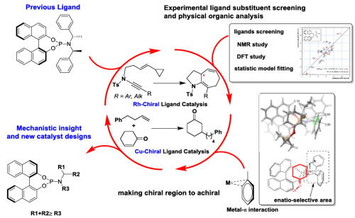 Through computational quantum chemistry we have explored how the structural elements of the phosphoramidite ligand affect catalyst structure and selectivity in Rh-catalysed asymmetry cycloisomerization2aand Cu-catalysed conjugate additions2b. Elucidation of the important interactions has been achieved by studying the effects of ligand-structural variation on both the catalyst structure and resulting enantioselectivity, through a combination of experimental and theoretical techniques. These studies illustrate the ability of quantitative structure-selectivity relationships to provide both models for asymmetric induction and catalyst structural hypotheses that may be further probed by experiment and computation. Collectively, such an approach leads to the rational modification/simplification of chiral ligands for more effective catalysts.