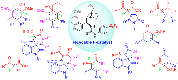 Organocatalysis has advantages of toxic heavy metal-free, mild reaction conditions, novel mood of activation, and good structural amenability. However, organocatalysis usually requires high catalyst loading (up to 20 mol%). Fluorous technology provides an efficient way to address the catalyst separation and recovery issue. This presentation highlights our recent effort on the development of recyclable organocatalyst-promoted cascade reactions involving fluorination, Michael addition, Robinson annulation, Mannich reaction, and other transformations for asymmetric synthesis of biologically interested compounds with multiple stereocenters.