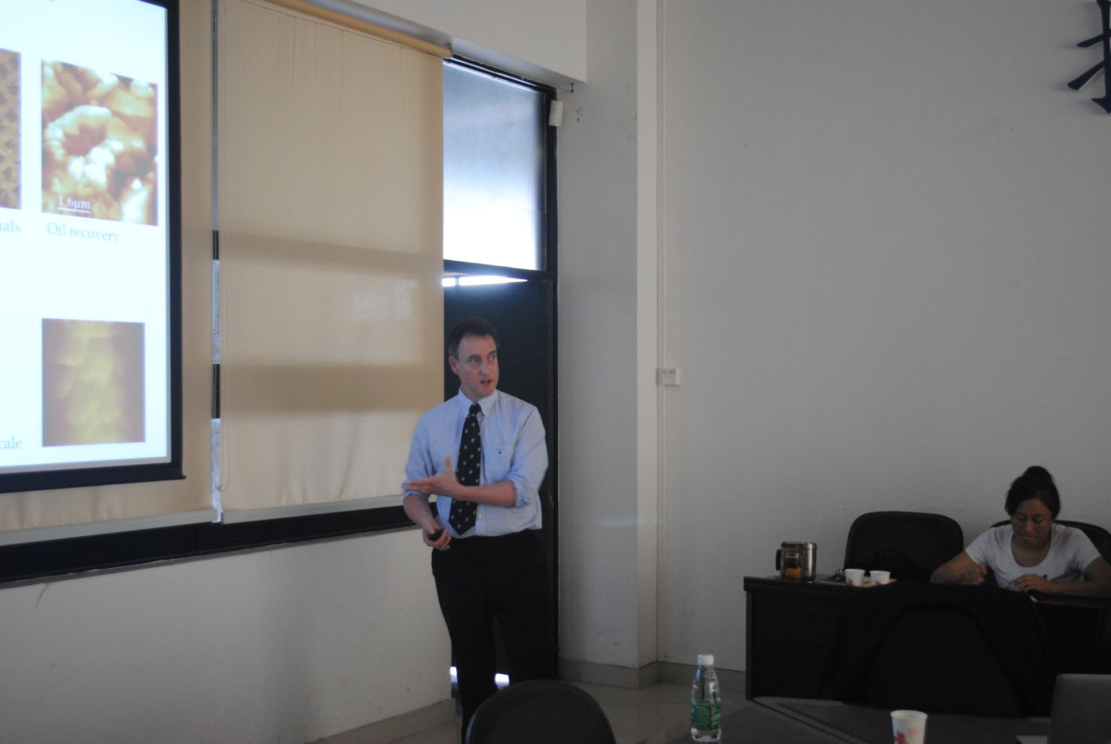 Colm教授的演讲深深吸引了广大师生的注意力,简短的休息后开始提问讨论。老师们就隧道扫描显微镜的分辨率以及成像问题跟colm教授做了交流。接下来,colm教授继续做报告,介绍了原子力探针显微镜在理解纳米磁性,输油管道结垢原理,原子力显微镜在理解头发丝表面电荷特性以及纳米间隙分子器件功能化成像等方面的应用。Colm教授的研究细致,讲解透彻,让广大师生深受启发,尤其是他的把问题理解透彻研究彻底的精神。其中,分子器件成像引发了杜志云副院长的浓厚兴趣,双方进行了详细的沟通交流。