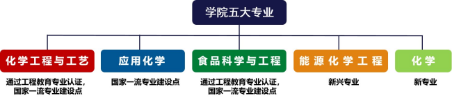 各专业特色鲜明,知名度高。化学工程与工艺专业,2010年入选国家特色专业,2019年通过教育部工程教育专业认证,同时入选国家一流专业建设点;应用化学专业,2019年入选国家一流专业建设点;食品科学与工程专业,2021年通过教育部工程教育专业认证,并入选国家一流专业建设点;能源化学工程专业,2020年开办,学科交叉新兴专业。化学专业,2024年开办,“强基计划”专业。