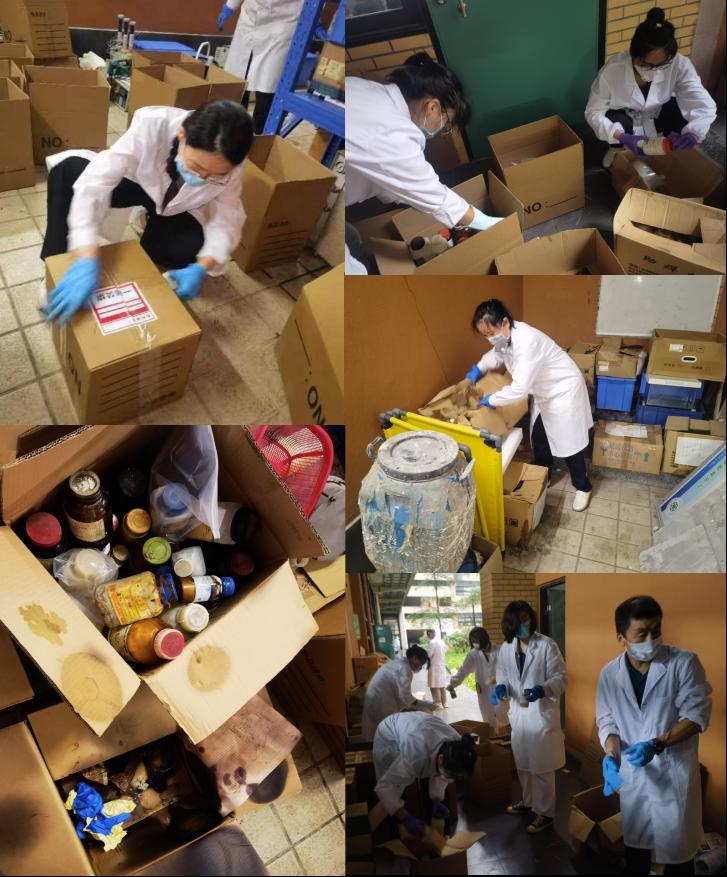 历史遗留的近百箱过期和无标签化学试剂,他们不畏艰难,历时五个多小时,以科学的态度和严谨的方法,有序地完成了分拣和处理任务。