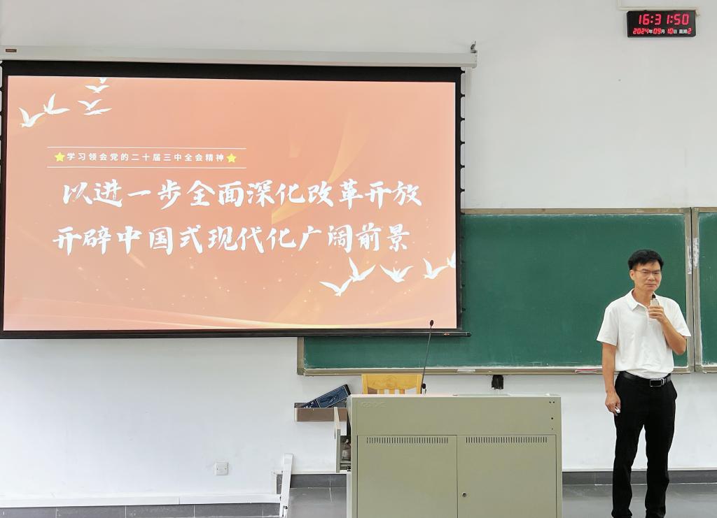课上,周东斌首先强调了党的二十届三中全会的重要意义,指出这次全会是在以中国式现代化全面推进强国建设、民族复兴伟业的关键时期举行的一次十分重要的会议,是新时代新征程上推动全面深化改革向广度和深度进军的总动员、总部署。他希望全体同学要深入学习领会全会精神,切实把思想统一到党的二十届三中全会精神上来。
