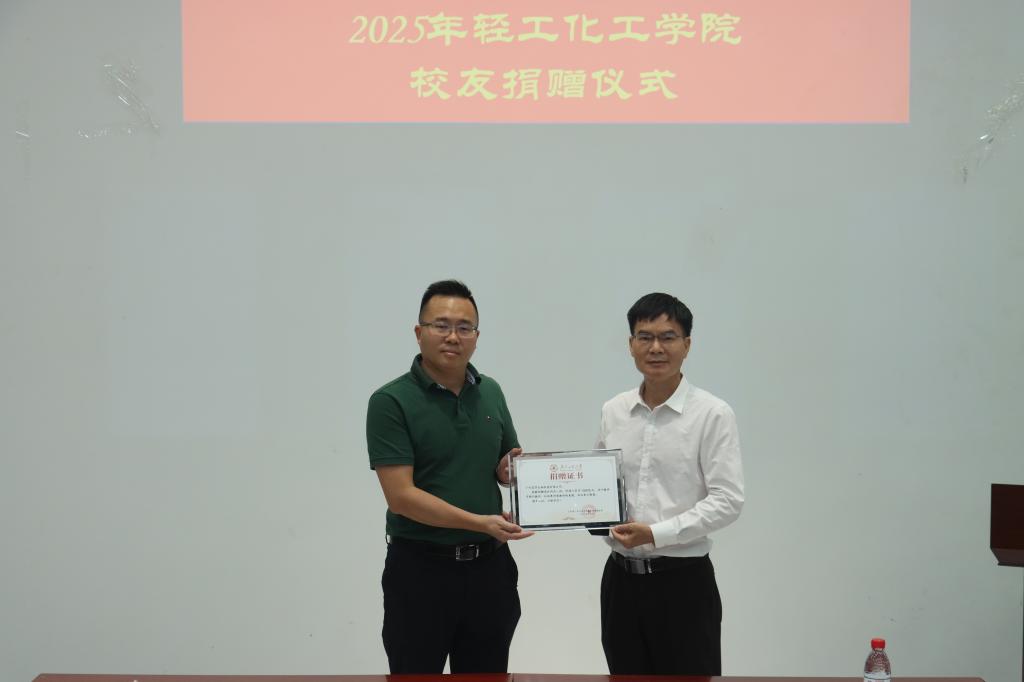 接受捐赠,并向两位校友颁发捐赠证书,学生代表向校友献花致意。