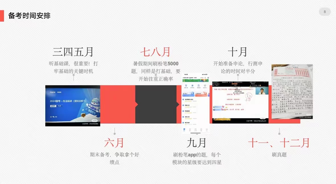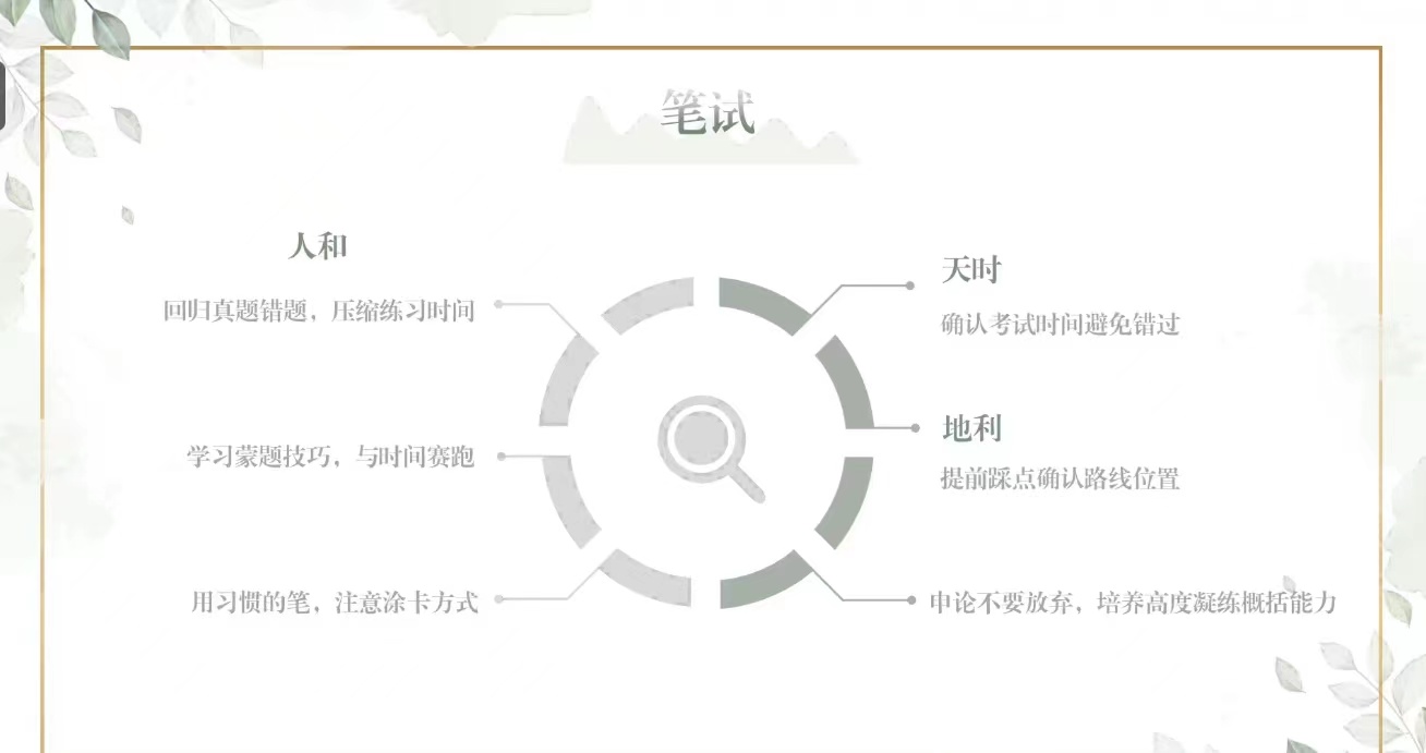 郑颖娜同学结合国考经验,以“心态、调整、复习、未来规划”四个角度为切入点分享以下经验:一要以“最后一场考试”的心态全力以赴,二要根据国考和省考的侧重点及时调整复习方向和答题速度,三要及时总结复盘他人经验,选择适合自己的复习资料和学习方法。