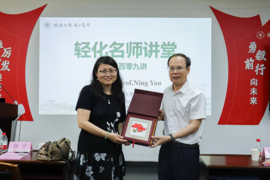 在互动和提问环节,可持续创新技术研究院院长张山青教授对颜宁院士的报告给予了高度评价,并就报告内容进行了深入的讨论与交流。本次讲座结束后,邱学青校长对颜宁院士的精彩报告表示感谢,并赠送了纪念品。