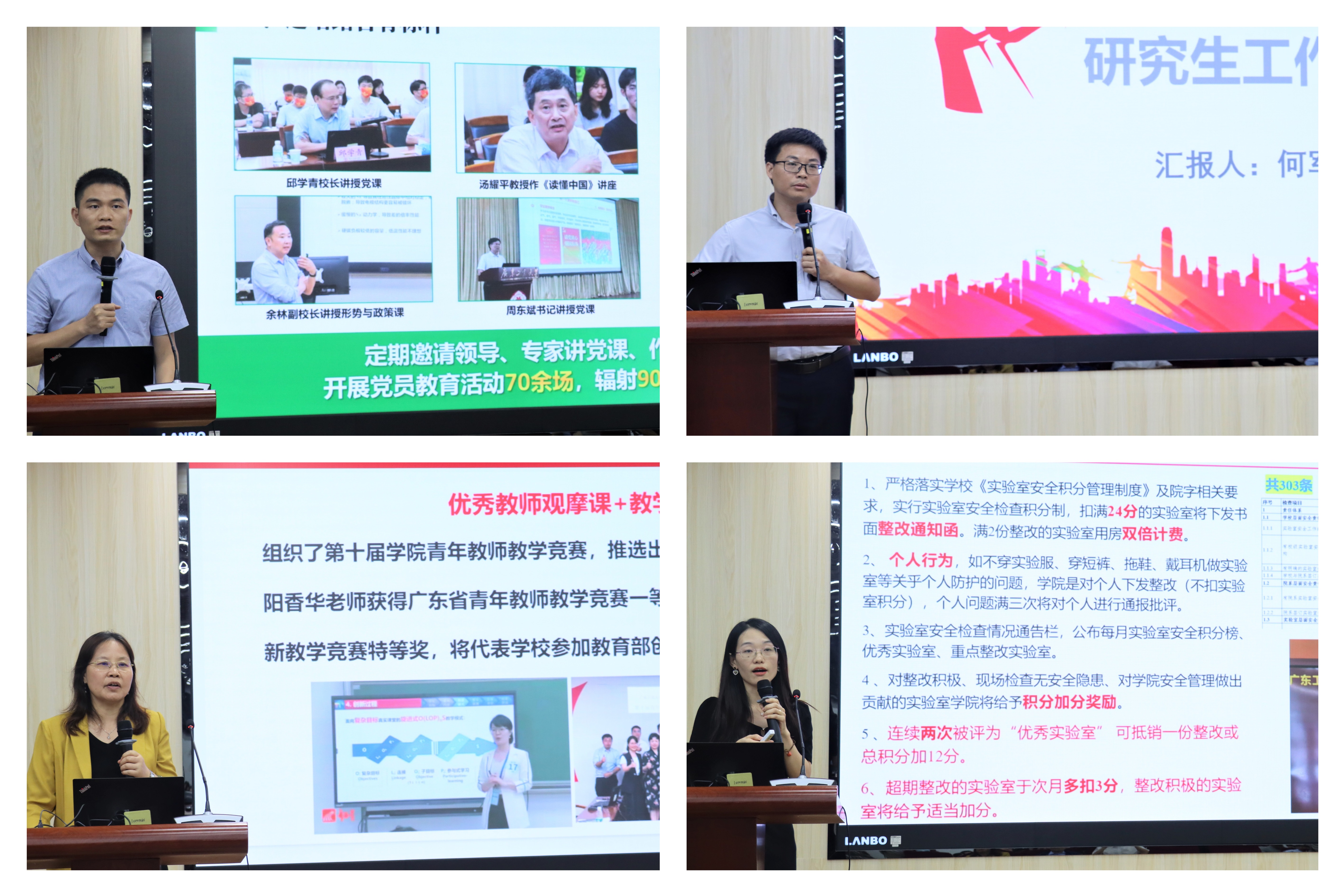接着,live007比分 其他领导在会上分别作了所分管的工作总结并提出今后工作重点。党委副书记杨刚围绕以赋能学生全面发展为中心目标,扎实推进五大计划,实施N项工作举措‘1+5+N’工作机制”总结了本学年学生工作,同时杨刚作为工会主席展示了工会小家的建设情况,总结工会工作成效,并动员live007即时比分 教职工积极参与工会活动。何军副院长总结了研究生招生规模与培养情况以及学位点建设相关工作,他提出申请材料与化工专业博士点的近期目标和申请化学一级学科博士点的远期目标。郑育英副院长从课程建设和专业建设两方面回顾了本科教学工作的建设情况,并介绍了live007即时比分 2023年教学改革项目和质量工程项目。钟远红副院长总结了实验室建设与安全管理工作、大型仪器共享平台管理工作和实验室建设项目情况,同时通过实验室前后对比图充分肯定了live007即时比分 师生对实验室安全的重视及实验室安全文化的建设成效。